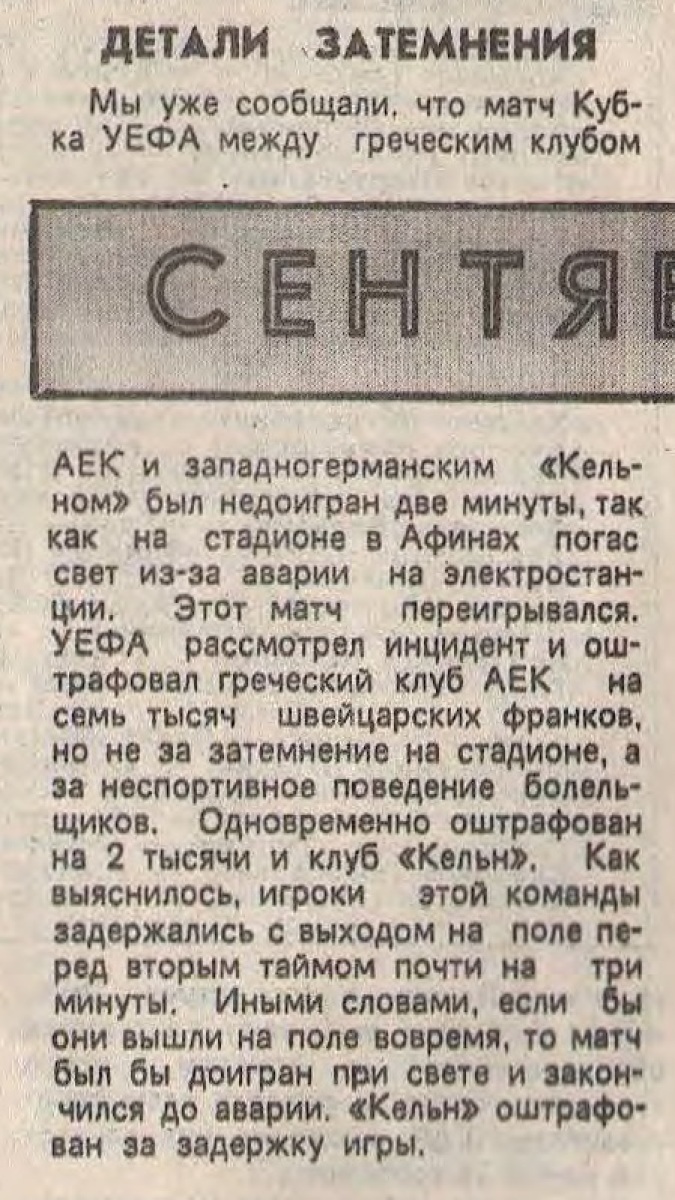 Остановлен на 88 минуте из-за проблем с освещением и переигран 28.09.1982.