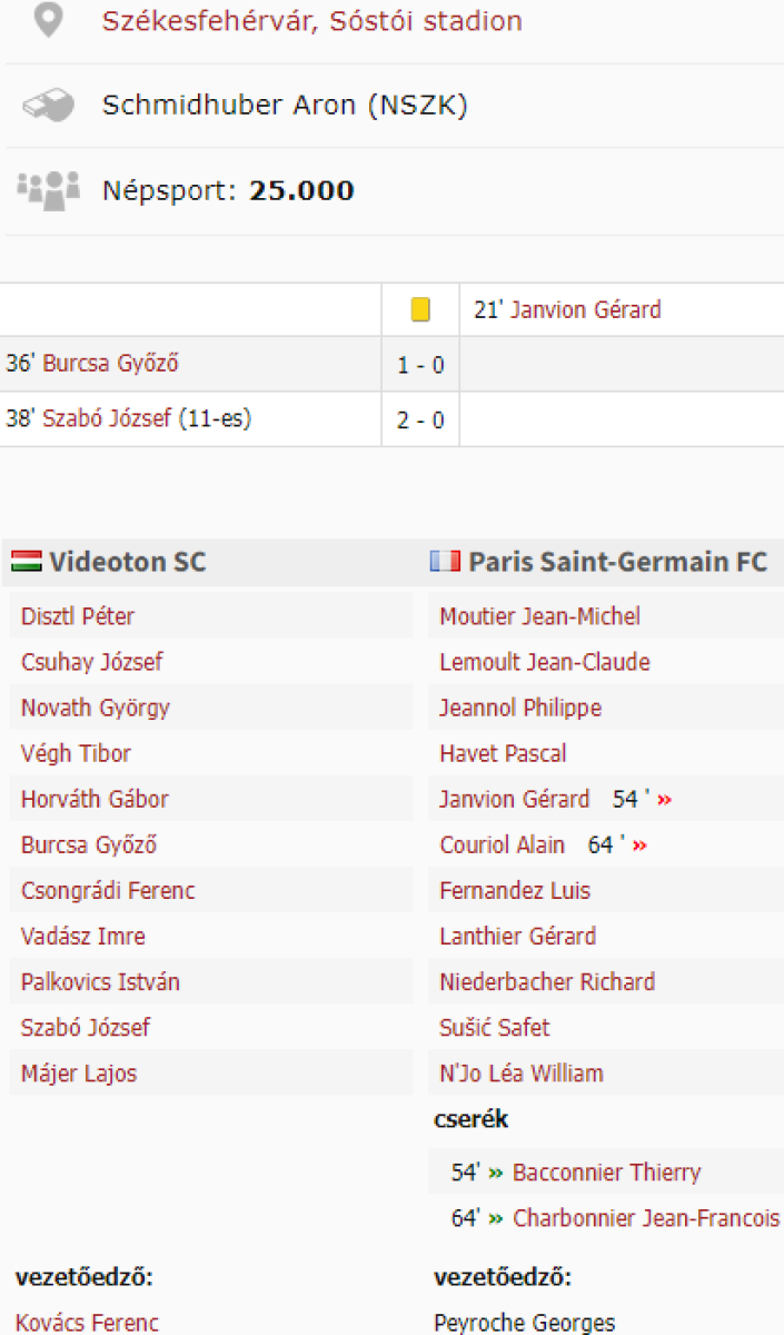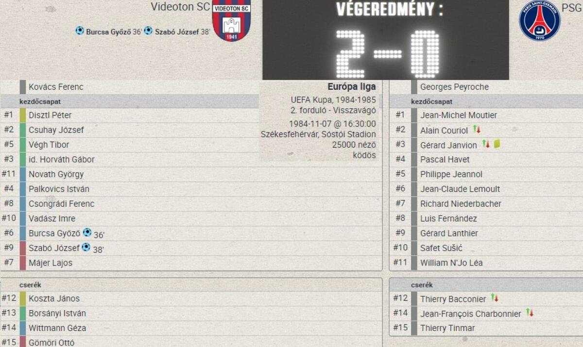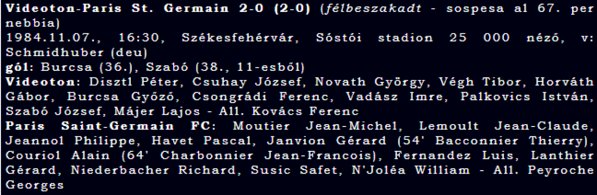 Матч был прерван на 67-й минуте при счёте 2:0 в пользу Видеотона из-за густого тумана. Было решено переиграть этот матч на следующий день с 1-ой минуты.