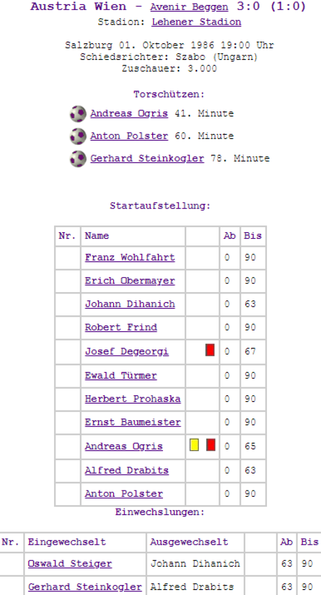 Матч состоялся в Зальцбурге, так как УЕФА дисквалифицировал домашний стадион «Аустрии» на 1 матч еврокубков из-за неспортивного поведения зрителей 06 ноября 1985 года на матче Кубка чемпионов с Баварией.
