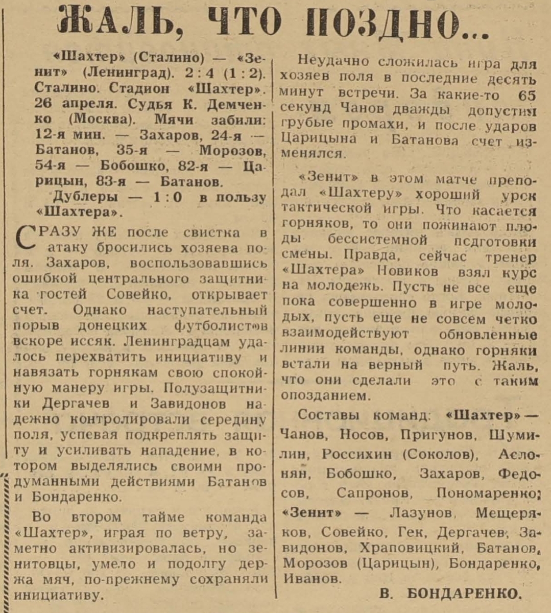 «Шахтёр» Сталино - «Зенит» Ленинград - 2:4