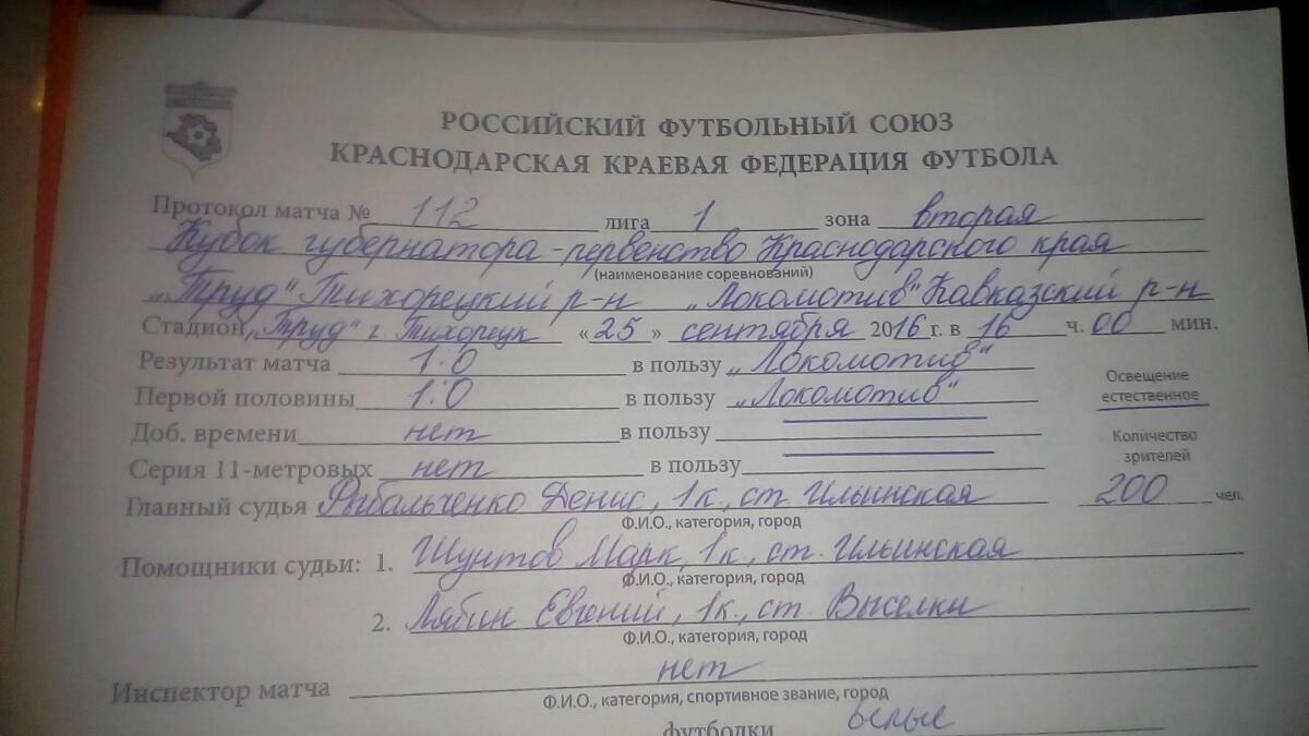 «Труд» Тихорецк - «Локомотив» Кропоткин - 0:1