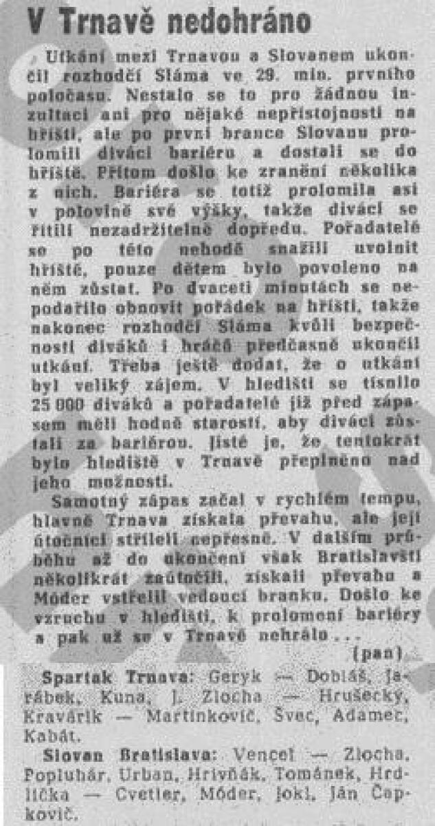Матч был прерван на 29-й минуте из-за беспорядков зрителей. Спартаку Трнава было засчитано тех.поражение- 0:3.