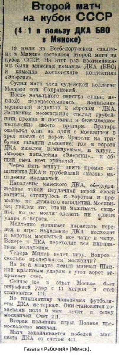 19 июля в Минске на Всебелорусском стадионе состоялась вторая встреча в борьбе за футбольный кубок СССР. В этот день на футбольном поле встретились команды Дома Красной армии (Минск, бывшая команда БВО) и спортивного товарищества «Энергия» (Москва).