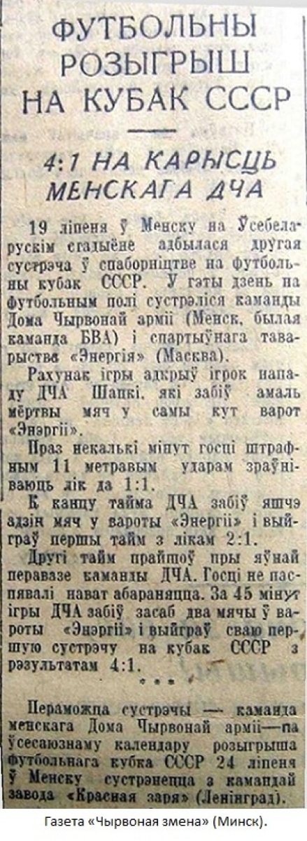 19 июля на всебелорусском стадионе состоялся футбольный матч на «кубок СССР» между командами физкультурного общества «Энергия» (Москва) и минского Дома Красной армии (БВО). Матч закончился со счетом 4:1 в пользу команды Дома Красной армии. (БЕЛТА).