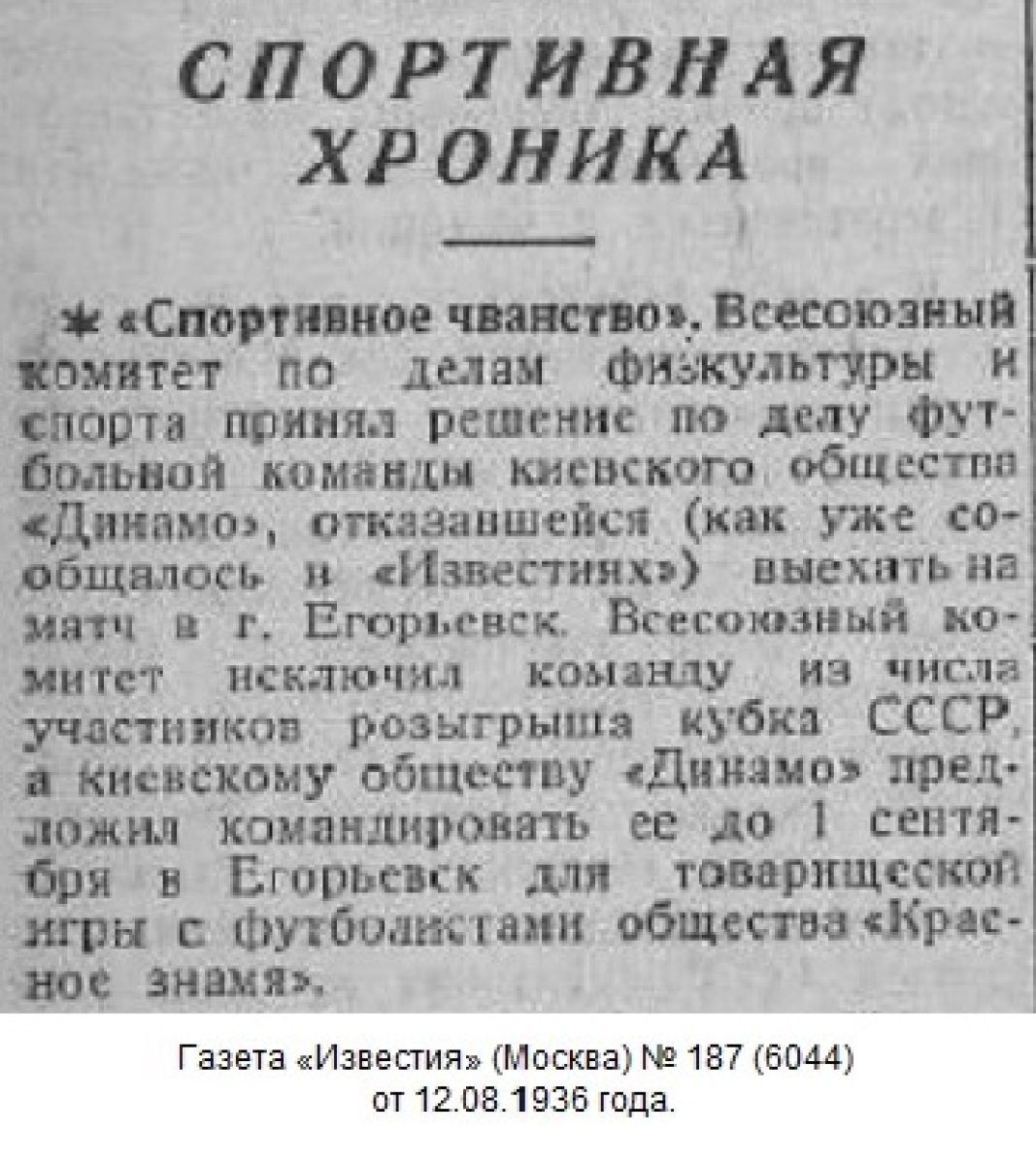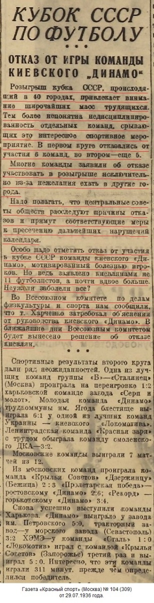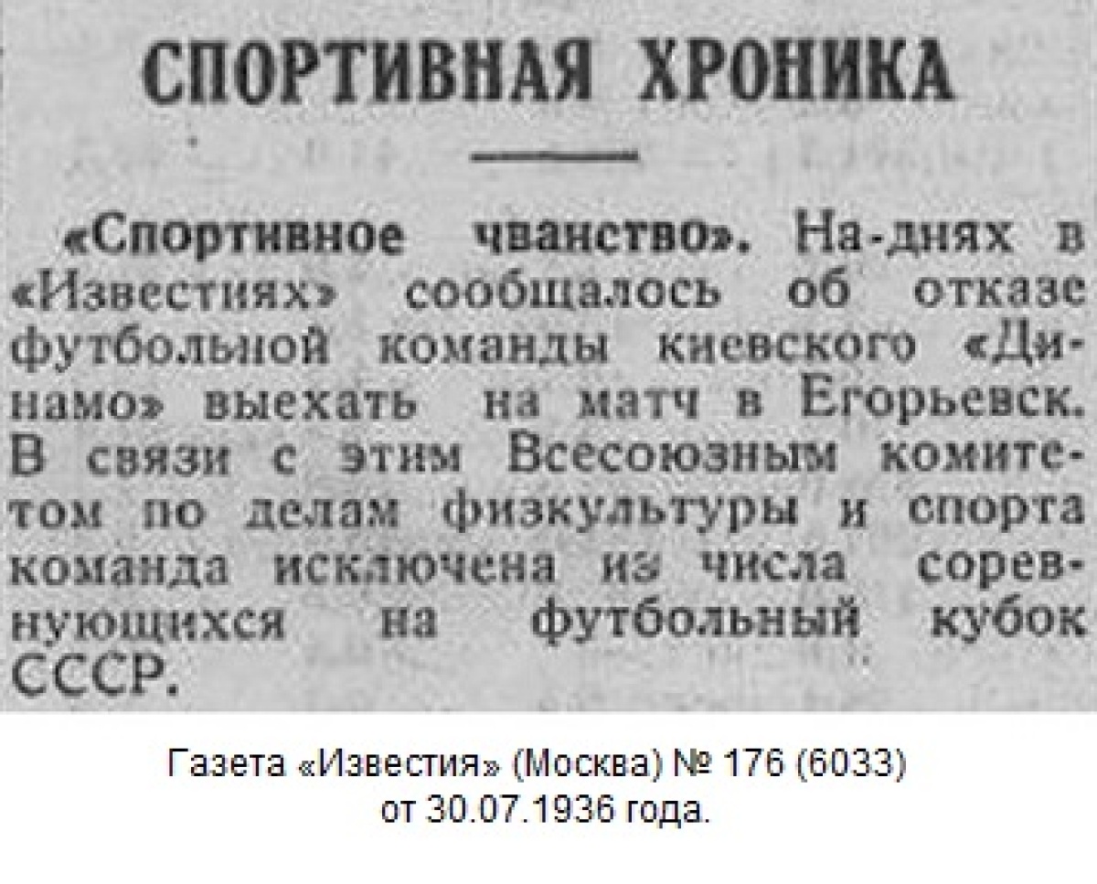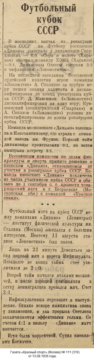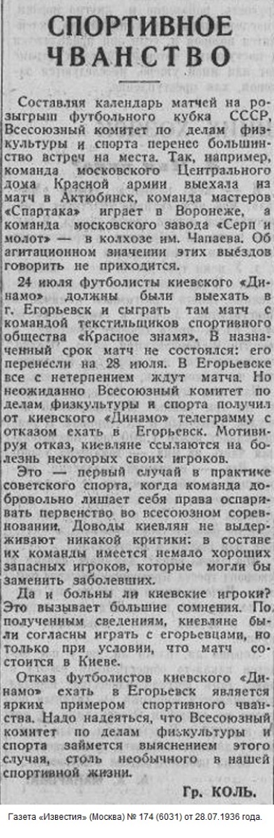 24 июля 1936 года в 1/32 финала команда «Динамо» (Киев) должна была встретиться с «Красным знаменем» из Егорьевска, однако киевляне на этот матч не приехали. Отказ от проведения этого матча был мотивирован занятостью команды в съемках художественного фильма «Вратарь», в которых принимала участие вся команда. Тогда мало кто допускал, что в будущем соревнования на Кубок СССР поднимутся на уровень второго по значимости турнира в СССР, и что престиж победы в этих соревнованиях будет таким большим.