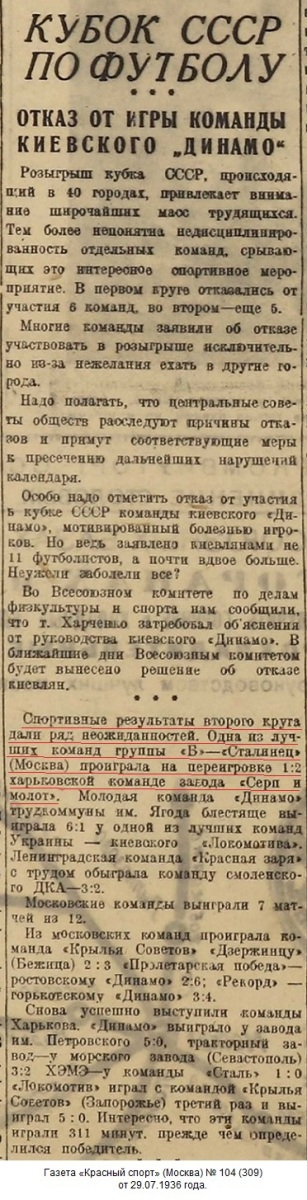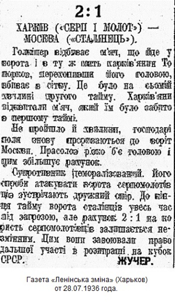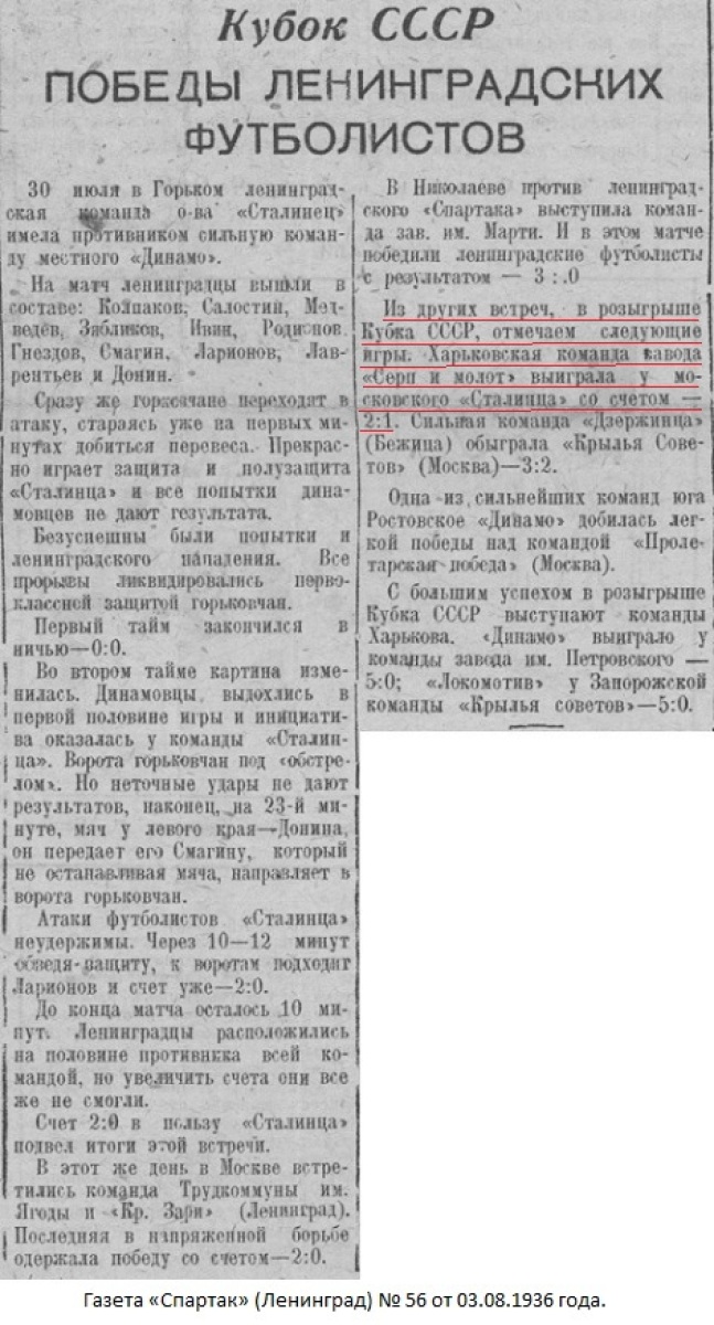 На днях многие тысячи харьковчан были свидетелями блестящей победы футболистов «Серпа и молота» над одной из лучших московских команд «Сталинец». В этом матче, благодаря высокому волевому напряжению и своевременному учету собственных тактических ошибок в первом тайме, команда «Серпа и молота» во второй половине разворачивает яростное наступление на ворота противника, выигрывая матч со счетом 2:1...