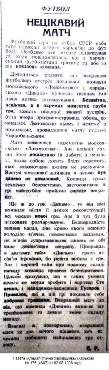 Приходится сказать, что вчерашняя футбольная встреча показательной команды московского «Локомотива» и харьковского «Динамо» принесла тысячам зрителей большое разочарование. Бесцветная, неинтересная, а в отдельных моментах грубая игра, вместо обещанной интересной встречи, была вчера продемонстрирована обеими командами. Помогло этому и нечеткое, с ошибками, проведение матча судьей Чернобыльским.