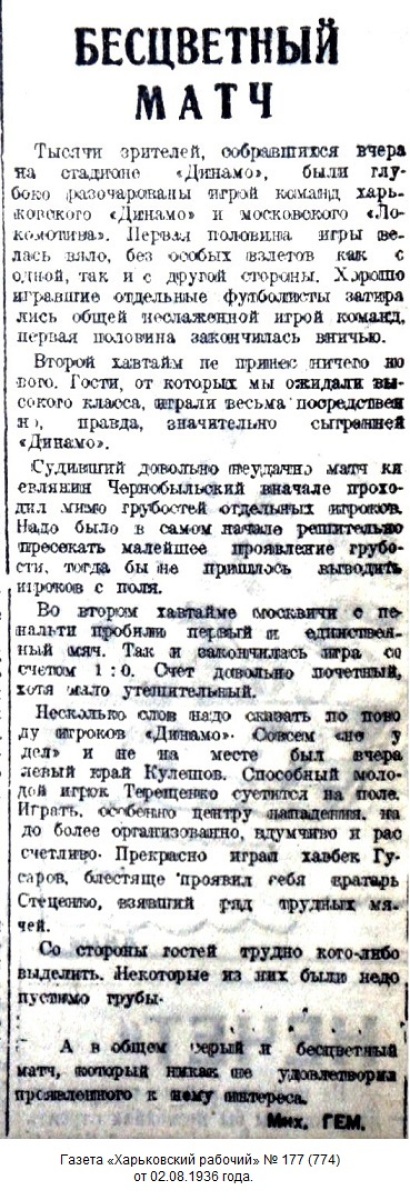 Что же до игры «Динамо», то от этой команды после ее некоторой реконструкции все ожидали новой игры. Но и здесь было полнейшее разочарование. Беспомощность показало нападение, левое крыло которого неумело владело мячом, постоянная передача мячей противнику уж никак не обещали динамовцам выигрыша. Правда, во втором тайме «Динамо» играло восемью игроками, потому что остальные выбыли из игры. Но и первый тайм при полном составе нападения команда провела безынициативно. Вполне понятно, что в таких условиях ничего не могли сделать и вратарь Стеценко, и нападающие-защитники Гусаров и Привалов, которые в этой игре показали себя хорошими игроками. Вчерашний матч показал, что команда «Динамо» требует еще тренированности и некоторой смены состава нападения.