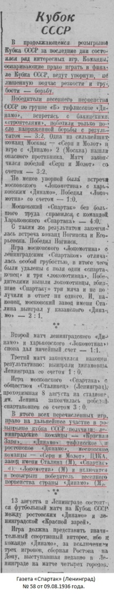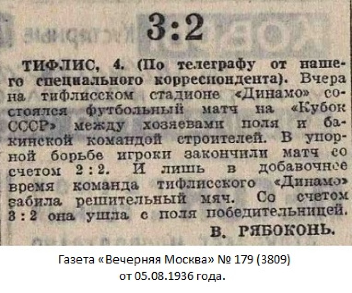 Тифлис. (От нашего спец. корр.). 3 августа на стадионе «Динамо» состоялась футбольная встреча на «Кубок СССР» между командами Баку («Строители») и Тифлиса («Динамо»).