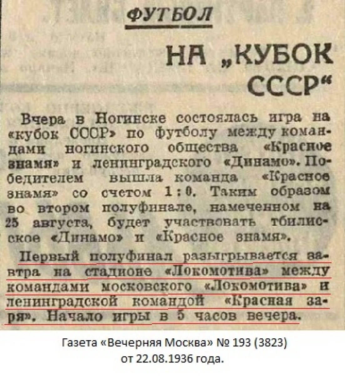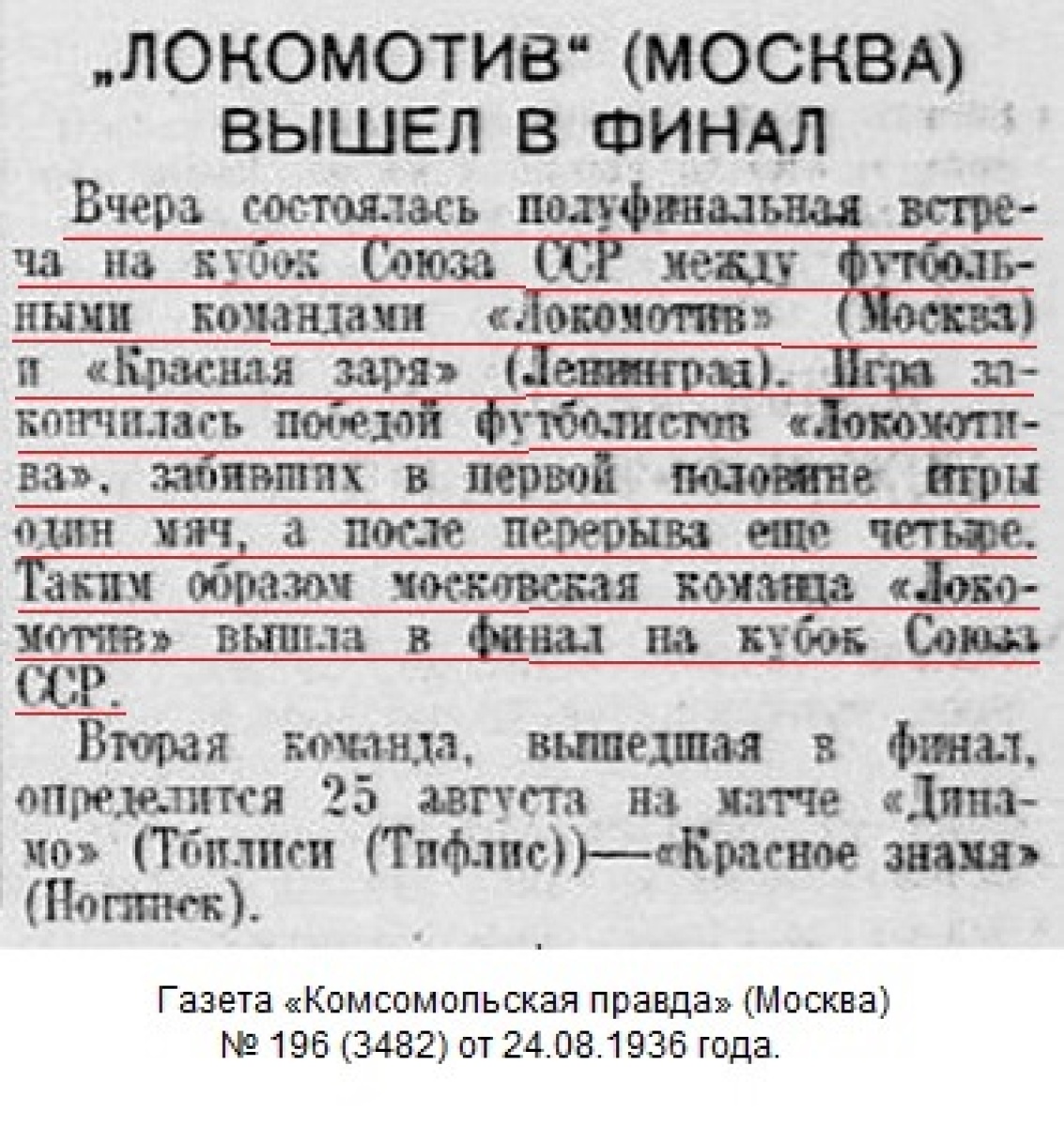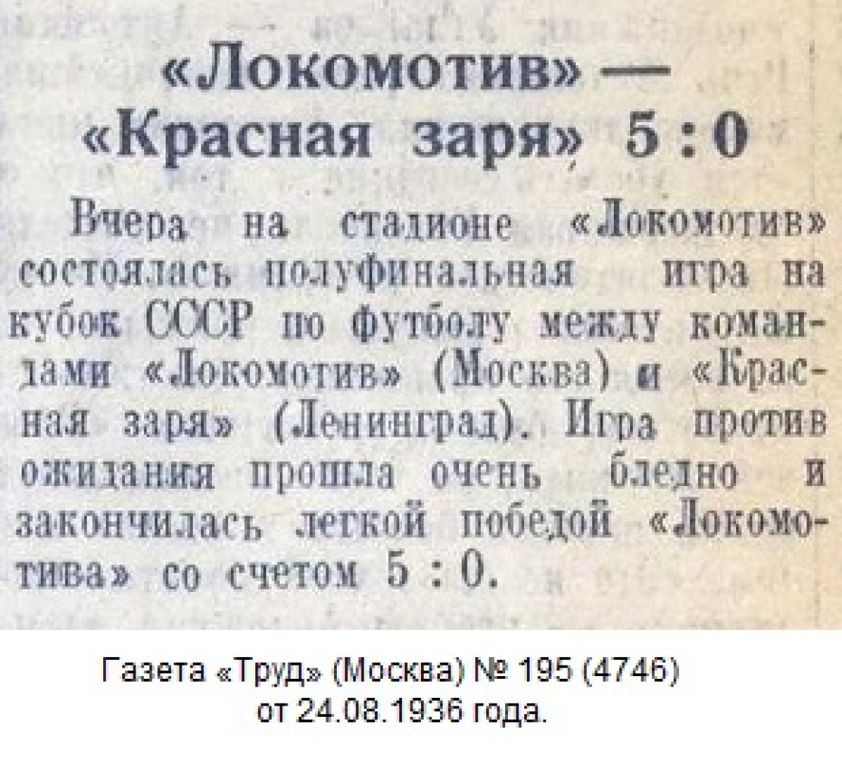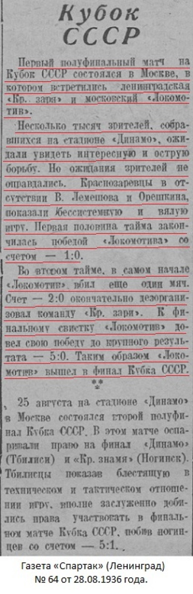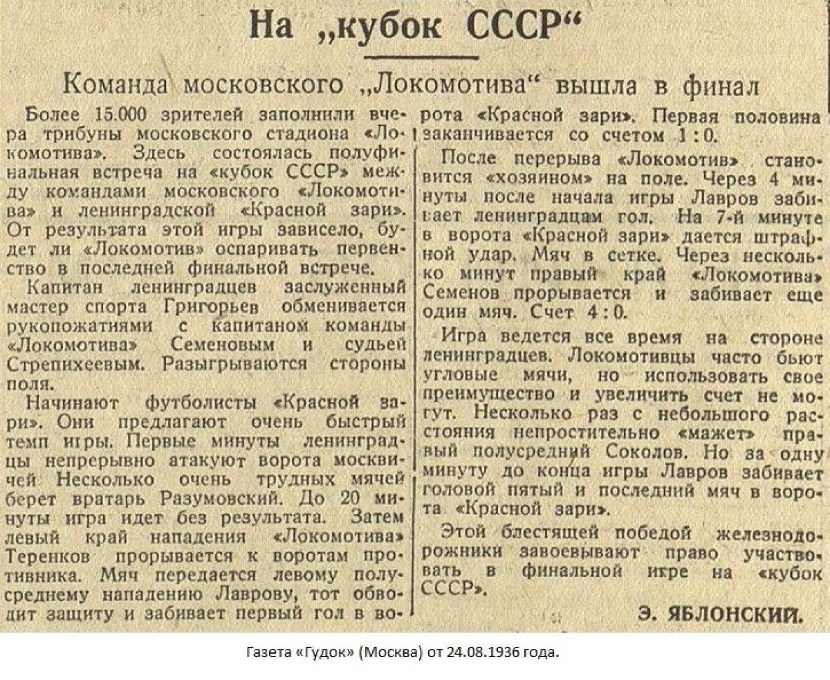 В полуфинале железнодорожники принимали многократного чемпиона Ленинграда «Красную зарю». Матч проводился на стадионе «Локомотив» на Новорязанской улице. Деревянные трибуны, крыши близлежащих домов – все усеяно зрителями. «Локомотив» одержал полную победу – 5:0. Виктору Лаврову удалось сделать «хет-трик» – забить три мяча.