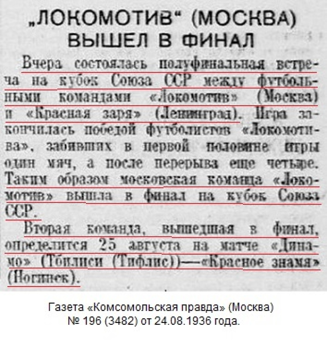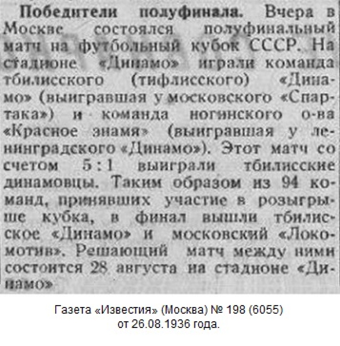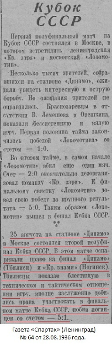 Как и следовало ожидать, в состоявшейся 25 августа полуфинальной встрече на «Кубок СССР» по футболу, тбилисское «Динамо», играя против ногинского завода «Красная Заря» выиграло с хорошим счетом 5:1.