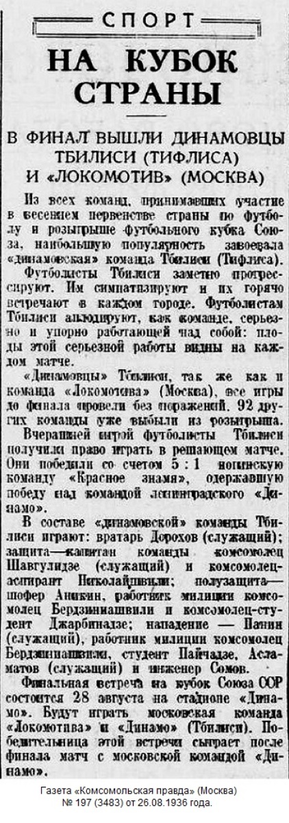Если учесть, что в розыгрыше московское «Динамо» участия, по-видимому, не примет из-за отъезда в Чехословакию, то есть большая вероятность, что кубок выиграет Тбилиси.