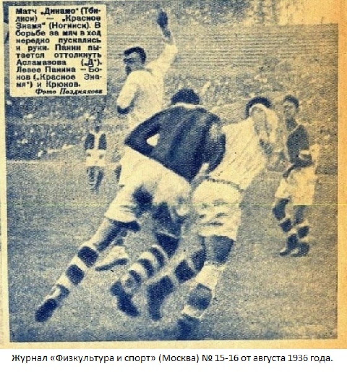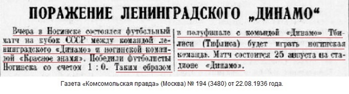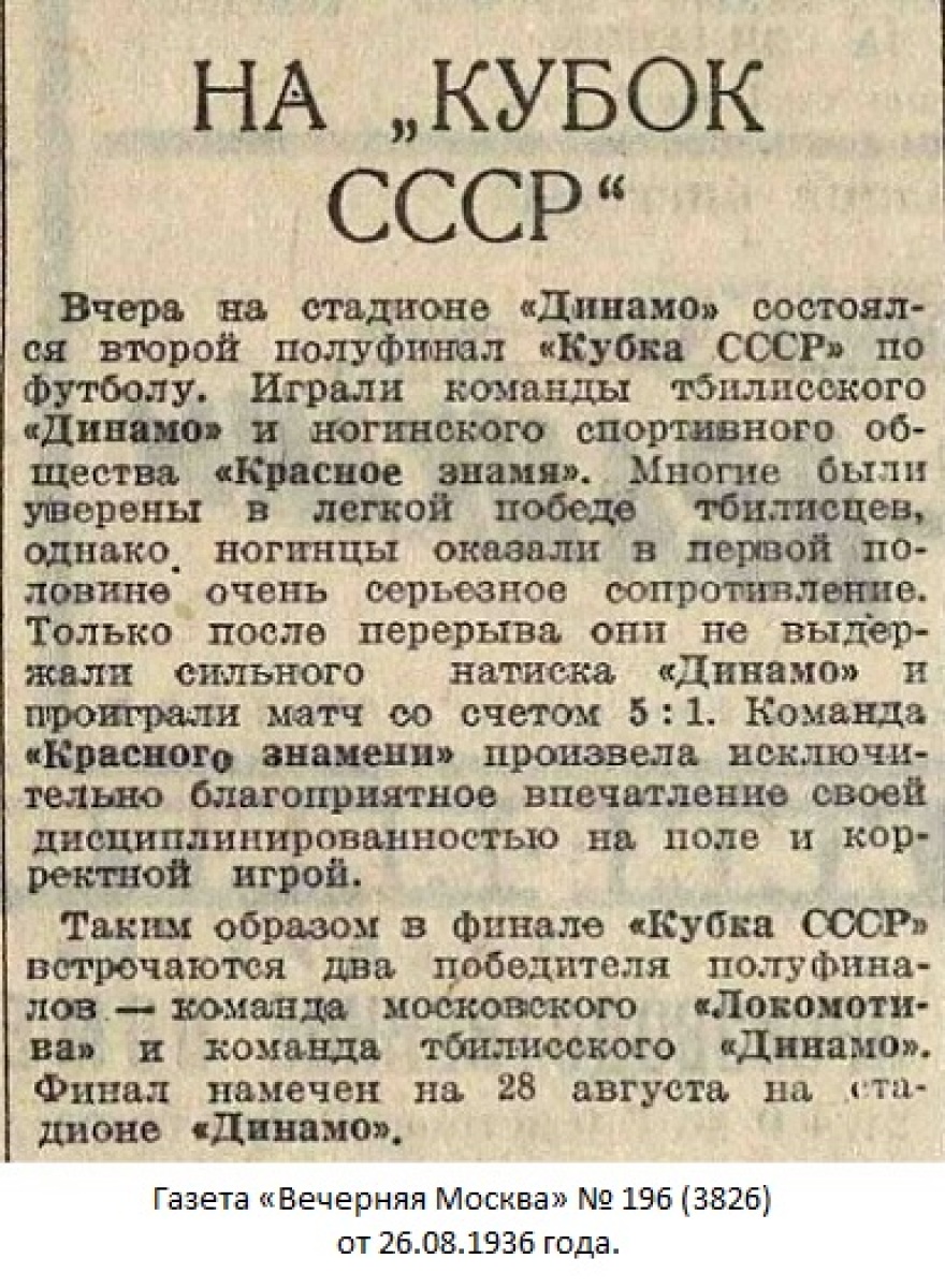Москва. (От нашего корр.). 25 августа на стадионе «Динамо» состоялась полуфинальная встреча на «кубок СССР» между командой тбилисского «Динамо» и командой общества «Красное знамя» (Ногинск).