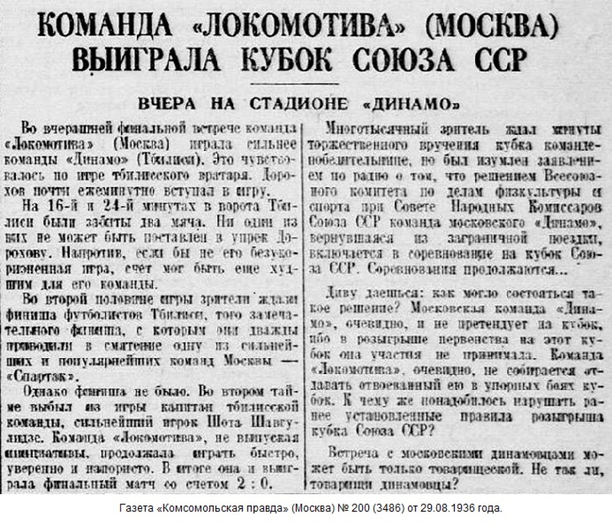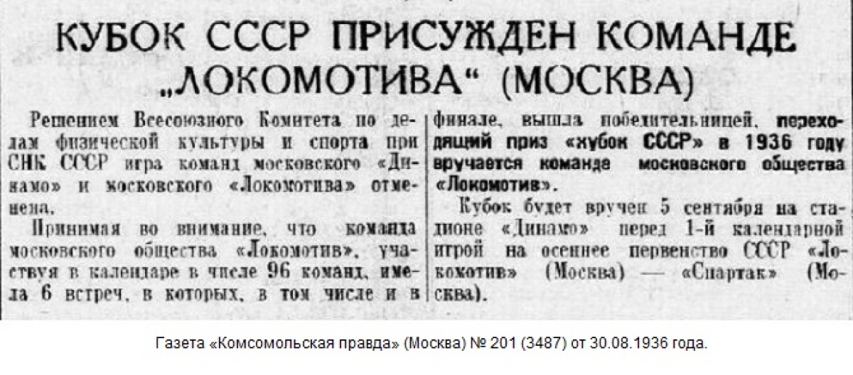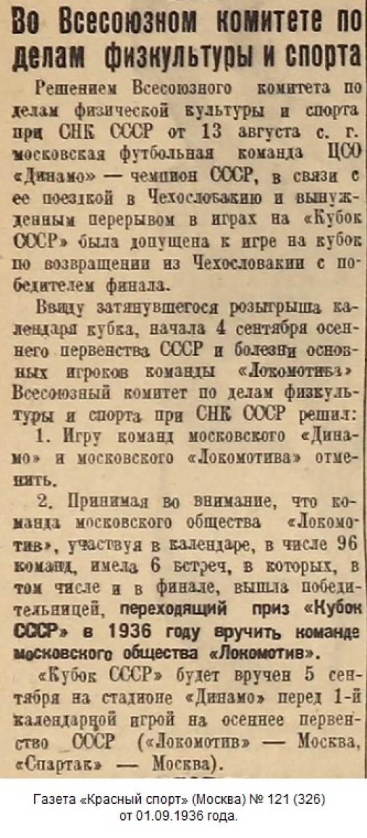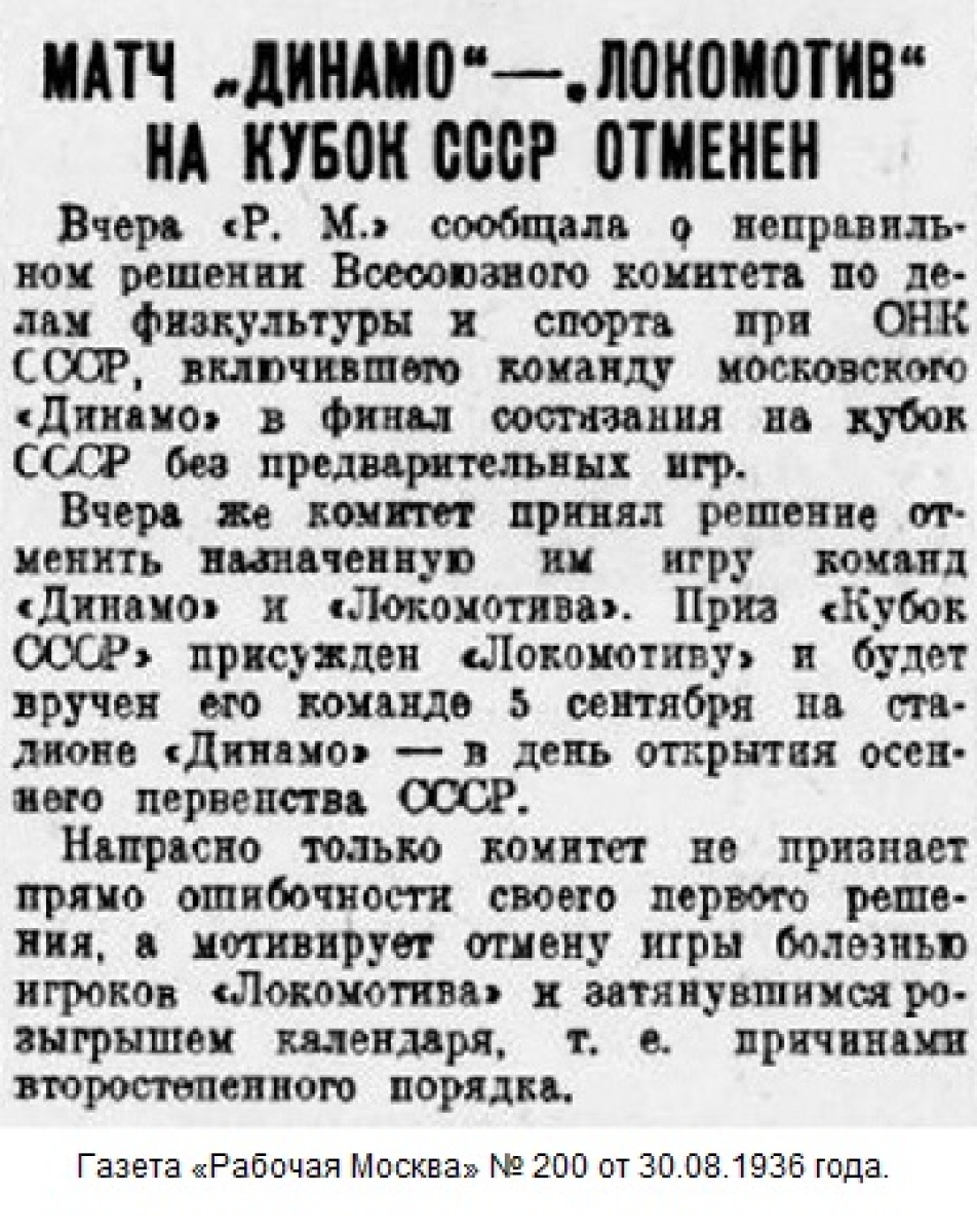 Комментарий. Финальный матч Кубка СССР 1936 года решили провести в Москве. Согласно жеребьевке хозяином поля в этом матче была команда «Локомотив» (Москва).