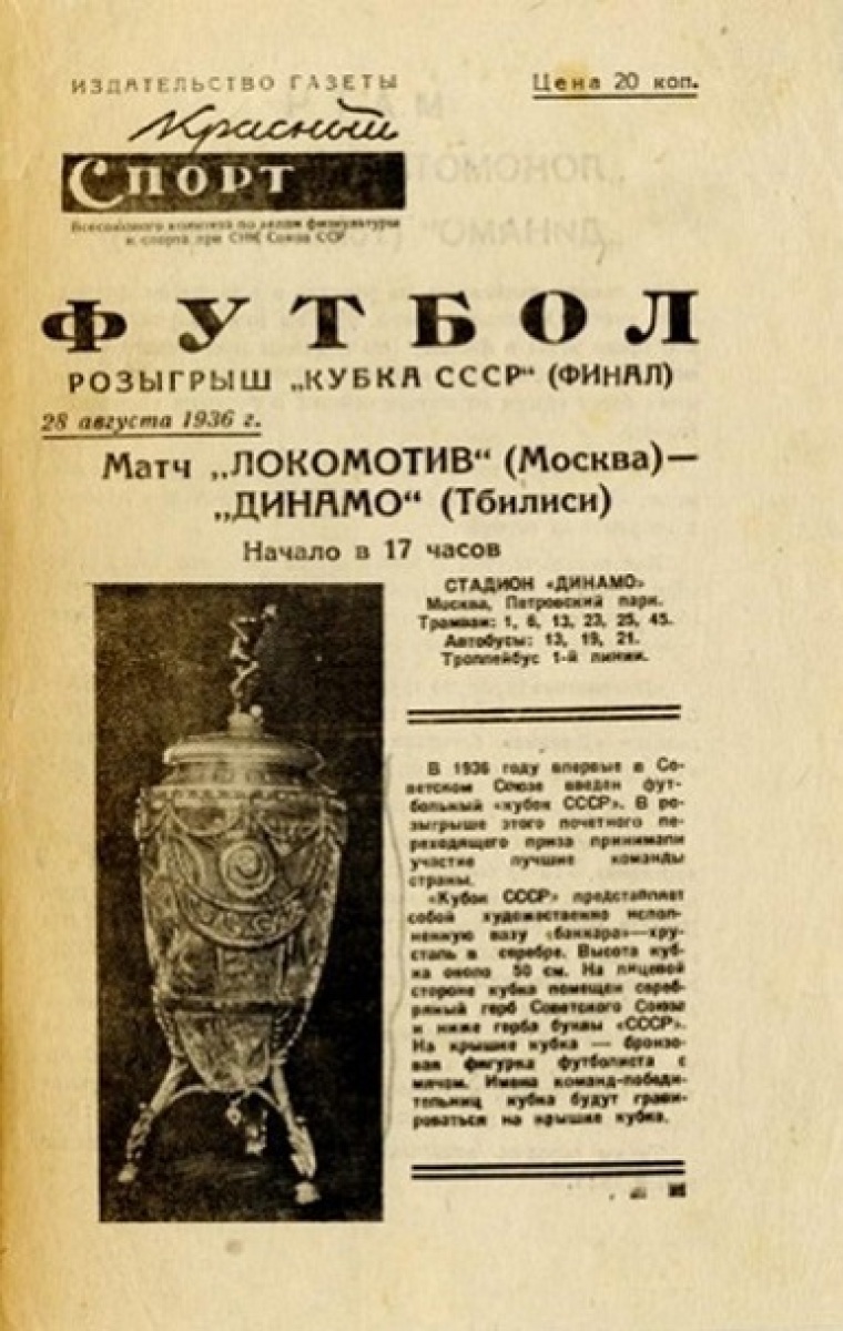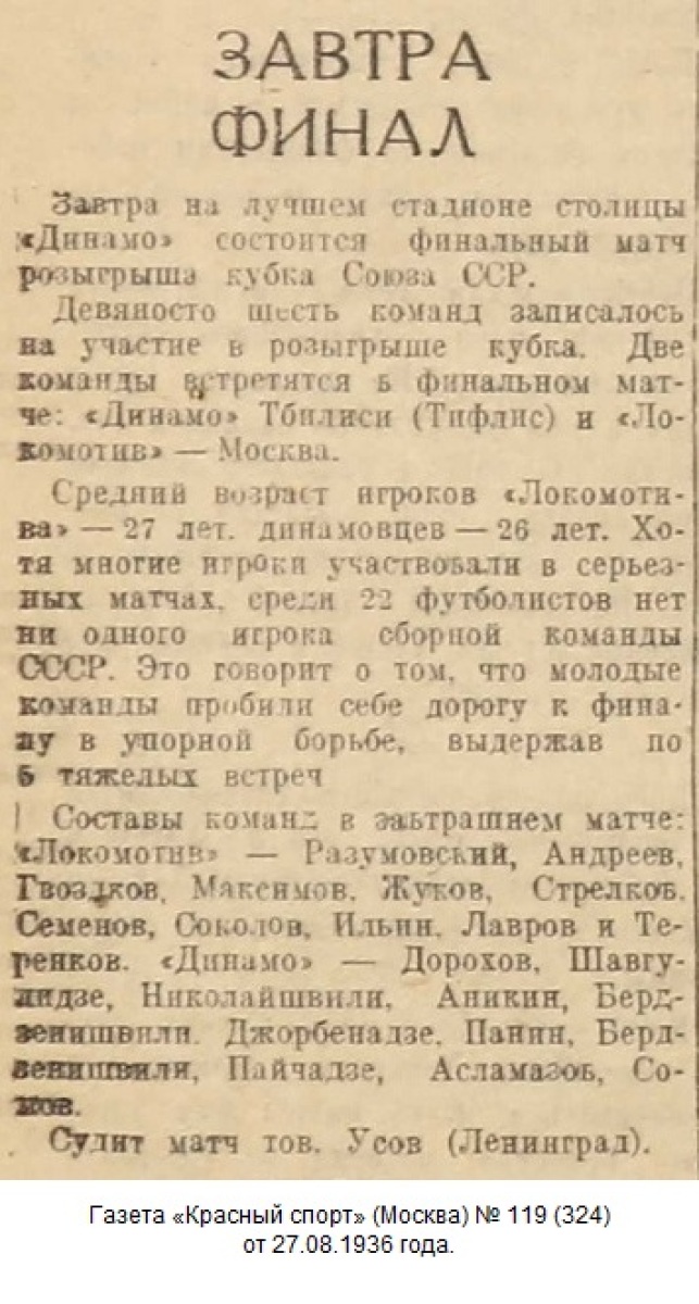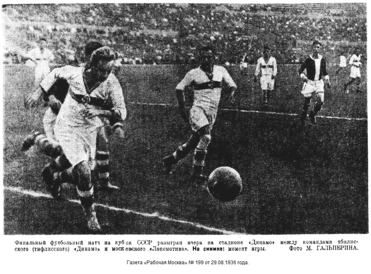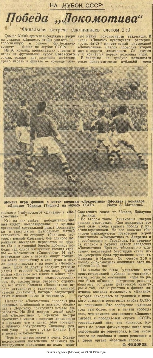 28 августа на стадионе «Динамо» в присутствии 22 тысяч зрителей состоялся финальный матч первого розыгрыша Кубка СССР. Играли железнодорожники и тбилисское «Динамо». Тбилисцам удалось победить до финала бакинцев, «Трактор», московский «Спартак» и в полуфинале ногинское «Красное знамя». Но им не удалось справиться с «Локомотивом». Судил матч ленинградец Н.Усов. Матч началcя атаками динамовцев.