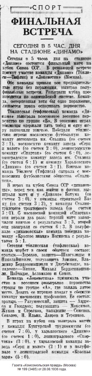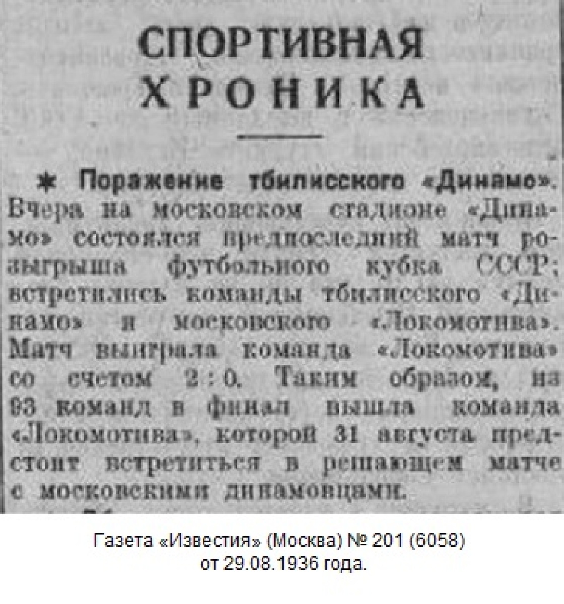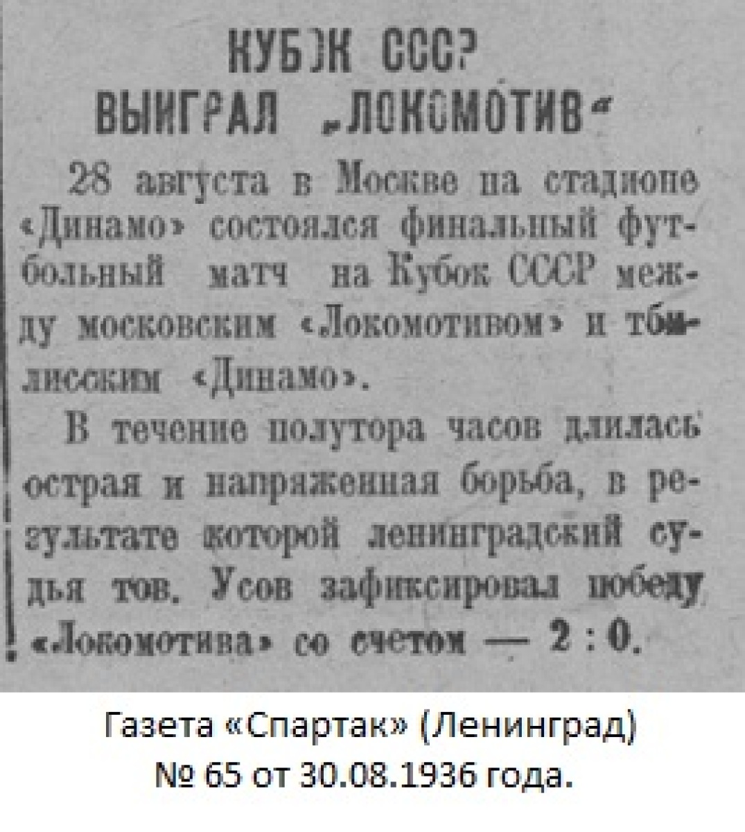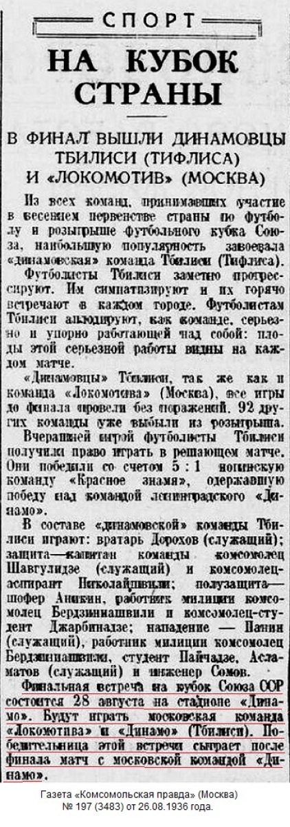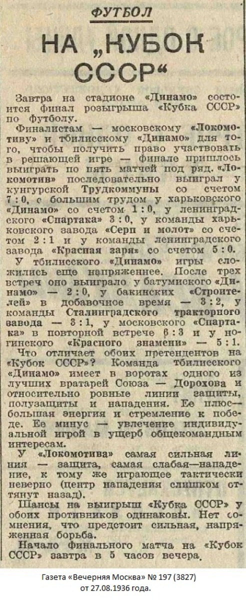 28 августа на стадионе «Динамо» в присутствии 22 тысяч зрителей состоялся финальный матч первого розыгрыша Кубка СССР. Играли железнодорожники и тбилисское «Динамо». Тбилисцам удалось победить до финала бакинцев, «Трактор», московский «Спартак» и в полуфинале ногинское «Красное знамя». Но им не удалось справиться с «Локомотивом». Судил матч ленинградец Н.Усов. Матч началcя атаками динамовцев.