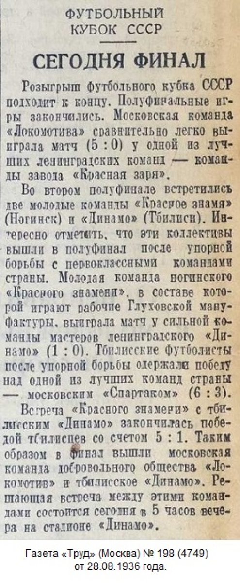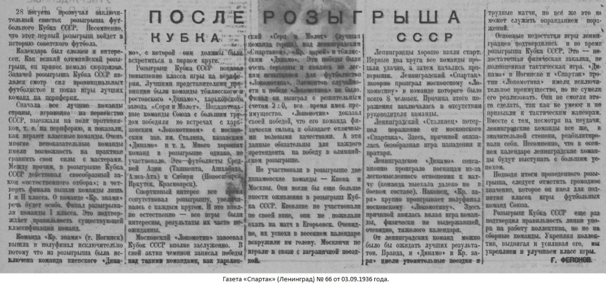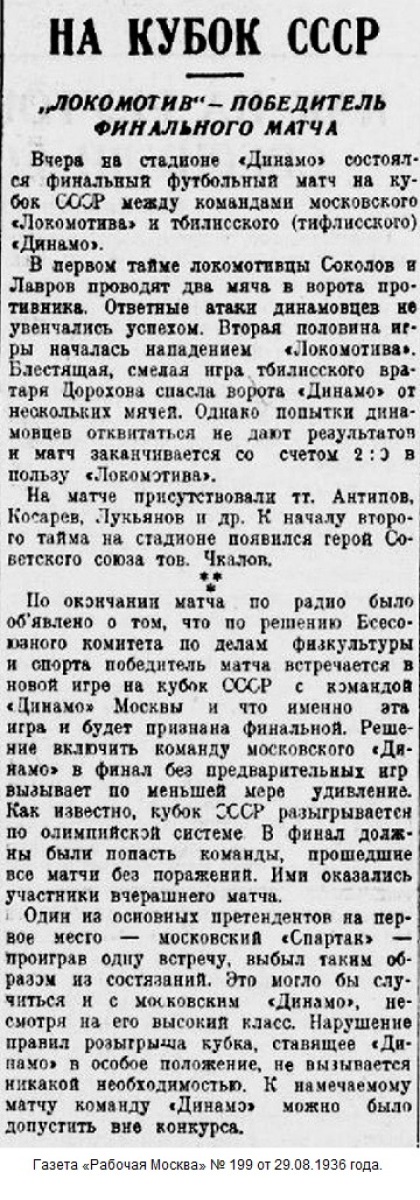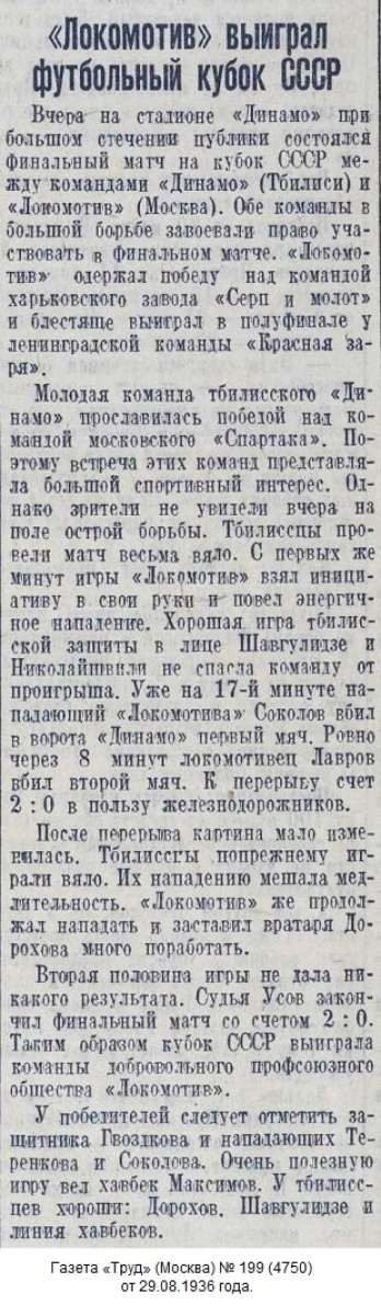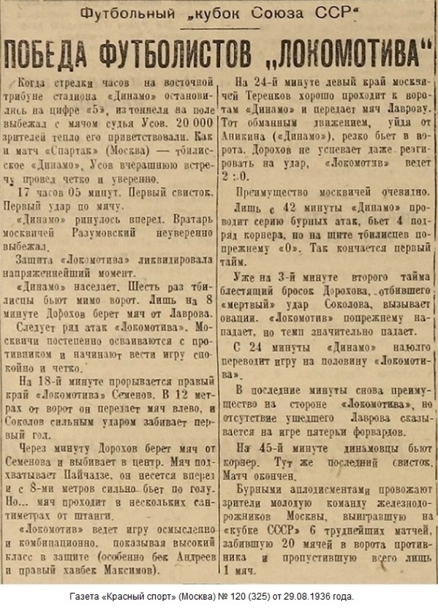 Команда «Локомотива» в целом играла ровно, энергично и напористо. Эта команда является сейчас бесспорно серьезнейшим противником для лучшей команды Союза – московского «Динамо», с которым она встретится в финальном матче 31 августа на стадионе «Динамо».