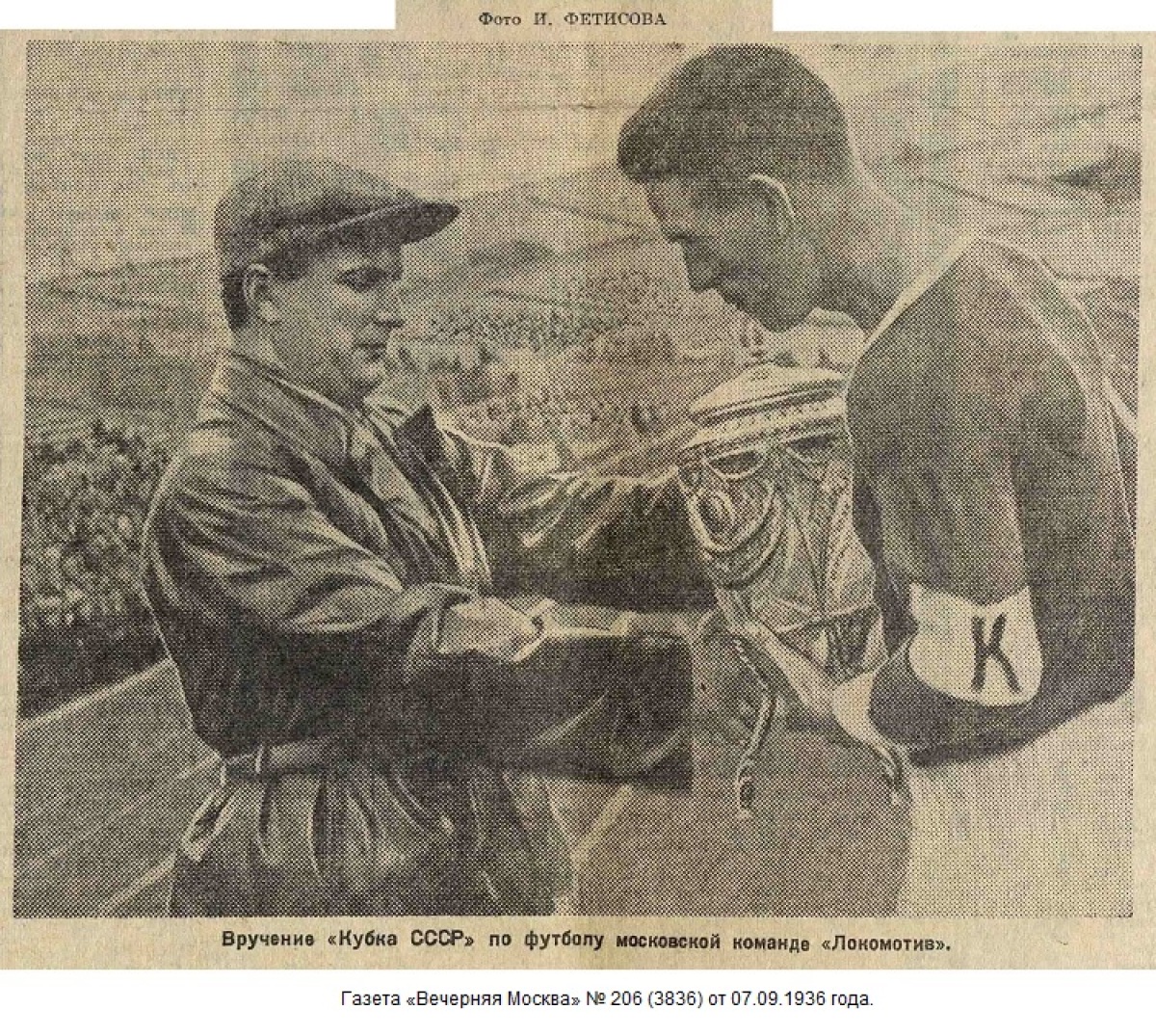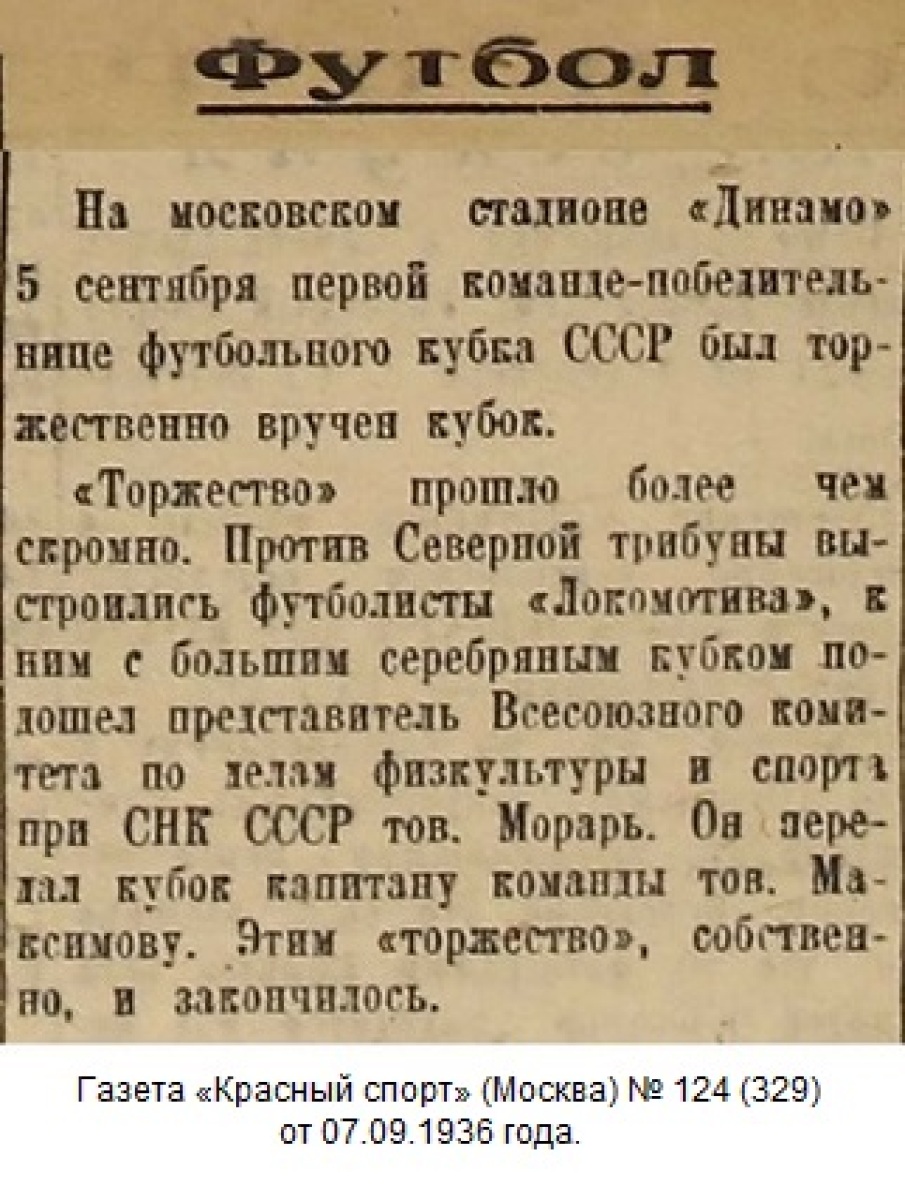 Кубок был вручен команде через неделю, 5 сентября 1936 г. перед началом первой игры осеннего первенства страны. Дело в том, что претензии на Кубок предъявили возвратившиеся из Чехословакии первые чемпионы – московские динамовцы. Было принято даже решение провести дополнительный матч между «Локомотивом» и «Динамо». Но затем оно было отменено, и железнодорожники по праву совершили круг почета с Кубком в руках.