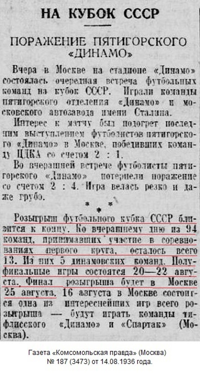 Первые матчи не принесли неожиданностей, если не считать того, что ленинградским динамовцам пришлось трижды играть с харьковским «Локомотивом», пока им удалось одержать верх (2:2, 1:1, 1:0). Но сенсации не заставили себя ждать. Когда К.Малинин во встрече 1/16 финала ЦДКА – «Динамо» (Пятигорск) забил гол в ворота гостей и армейцы повели 1:0, вряд ли кто-либо из зрителей на московском стадионе «Локомотив» предполагал, что москвичам грозят неприятности. Однако Мотлохов с пенальти сквитал счет, Гавашели забил второй мяч, а москвичи ничего не сумели сделать. Вратаря «Динамо» Айвазова зрители унесли с поля на руках. Отлично играли и нападающие пятигорцев, впоследствии известные футболисты тбилисского «Динамо» и донецкого «Шахтера» Т.Гавашели и Г.Балаба.
