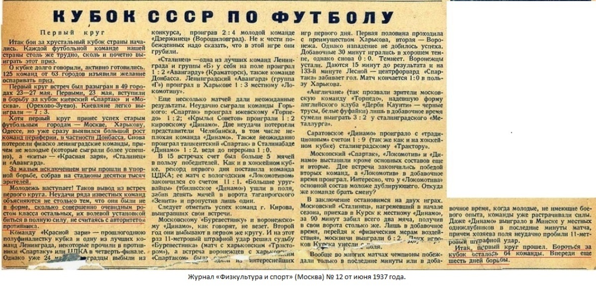 МОСКВА (Телеграфом от наш. кор.). 24 мая 124 футбольные команды Союза ССР в 51 городе выйдут соревноваться за футбольный «Кубок СССР».