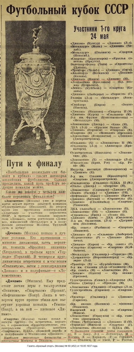 Около 10 тысяч зрителей собрались 24 мая на стадионе «Динамо» посмотреть первую игру на «кубок СССР» по футболу. Первыми выбегают гости – московская команда «Динамо», за ними – минские динамовцы.