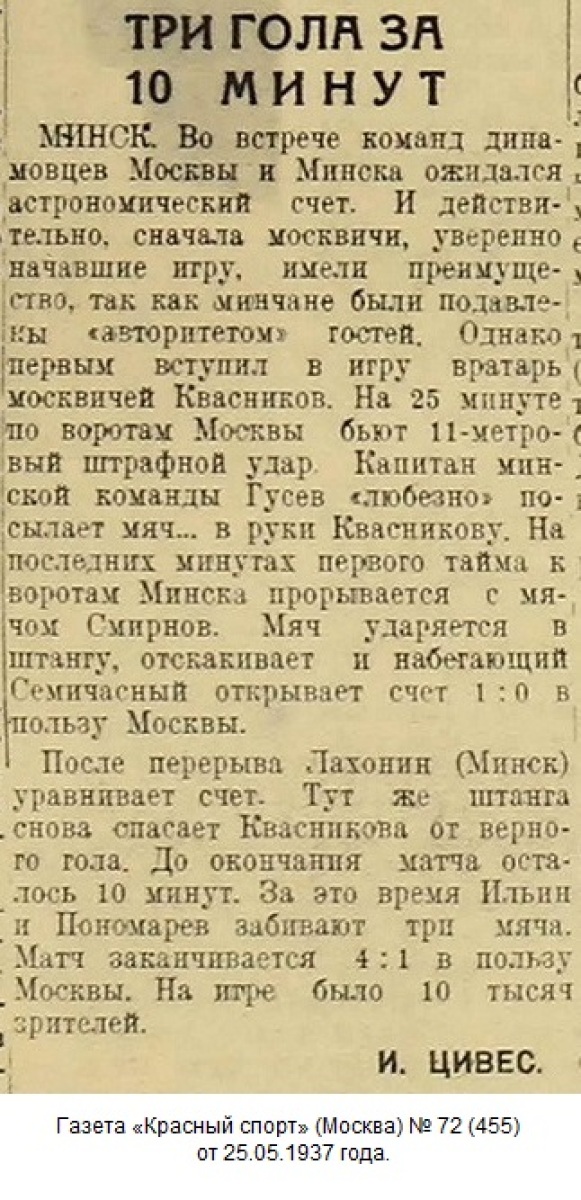 Игра началась. Спокойно и уверенно играют москвичи, футболисты Минска волнуются и излишне суетятся. Вот у ворот Москвы два раза возникает опасность, бьют «корнер» (угловой штрафной удар), но мастера мяча хорошо охраняют свою спортивную честь. Только перед окончанием первого тайма (половина игры) москвичи вплотную подошли к воротам Минска. Их центр нападения Смирнов посылает мяч в сетку, но тот ударяется в штангу ворот и отскакивает назад, его подхватывает правый край нападения Семичасный, который открывает счет – 1:0.