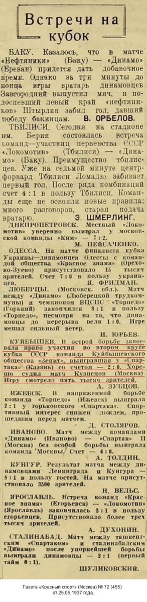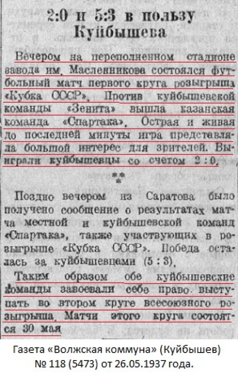 24 мая начался всесоюзный розыгрыш по футболу на Кубок СССР. В первом круге команда куйбышевского общества «Зенит», победительница городского розыгрыша, встретилась на своем поле с казанской командой «Зенит». Судил игру Кузнецов (Москва). До пяти тысяч зрителей смотрели этот интересный матч. Команды вышли на поле под звуки известной песенки из фильма «Вратарь», которая передавалась мощной радиоустановкой стадиона общества «Зенит».