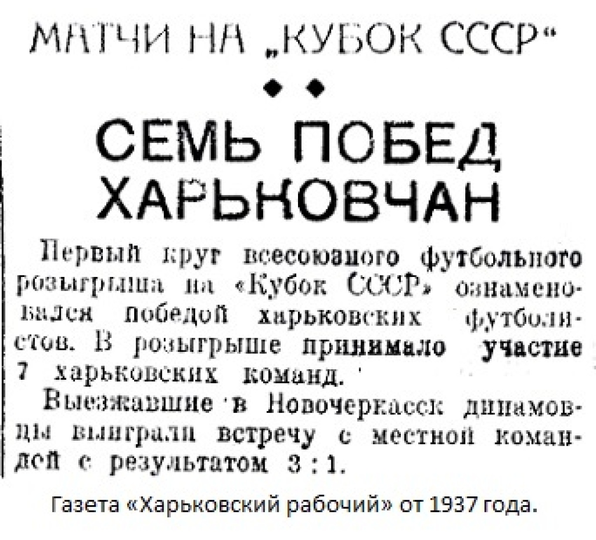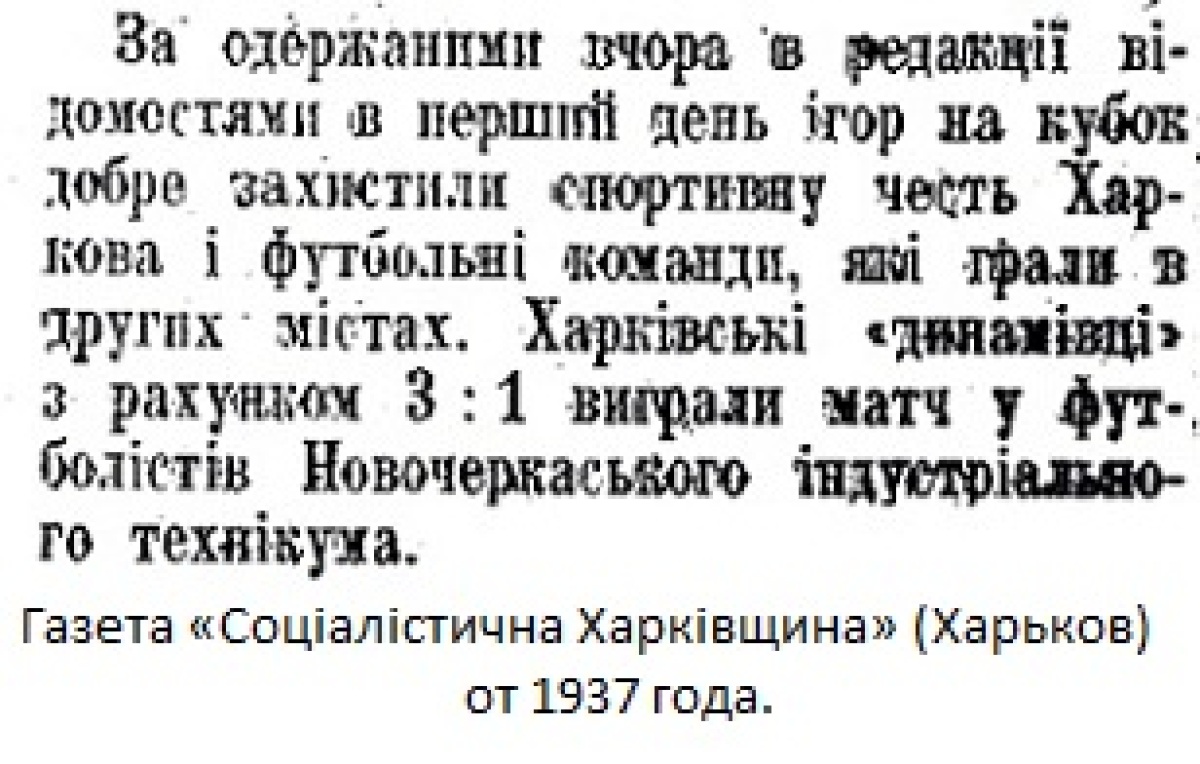 Согласно полученным вчера в редакции известиям, в первый день игр на кубок хорошо защитили спортивную честь Харькова и футбольные команды, которые играли в других городах. Харьковские «динамовцы» со счетом 3:1 выиграли матч у футболистов Новочеркасского индустриального техникума.