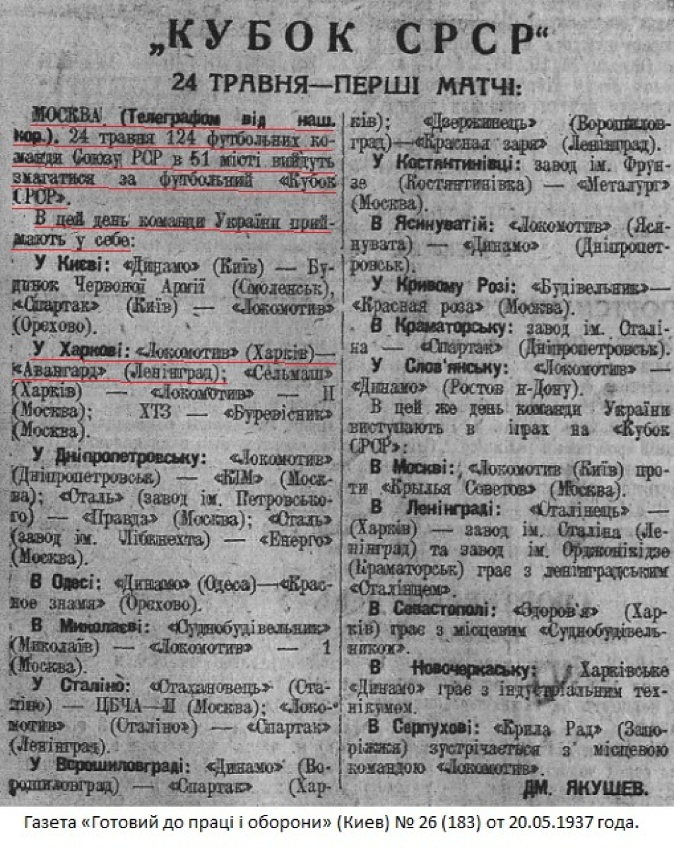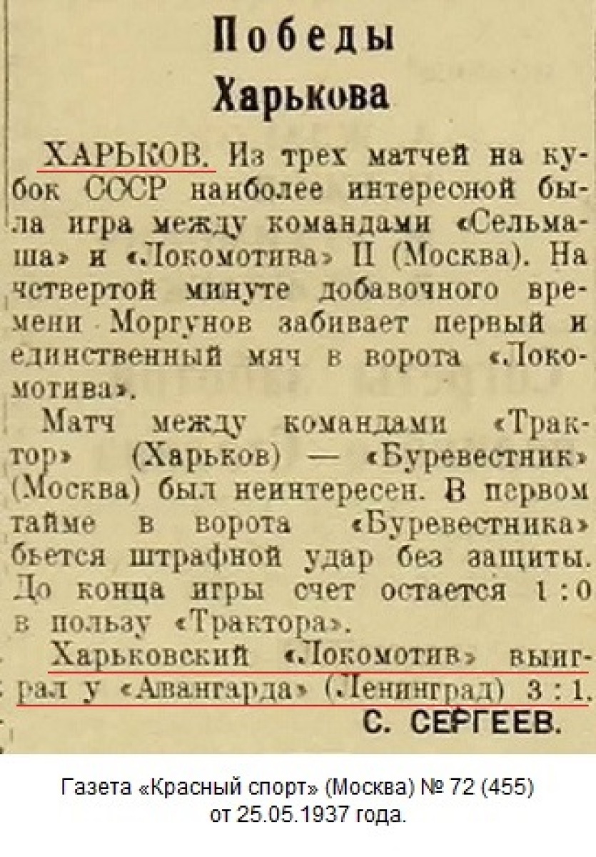 ХАРЬКОВ. 25 мая. (Телефоном наш. кор.). Вчера состоялись первые игры на кубок СССР. Энергично и интересно прошла встреча «Локомотив» (Х) – «Авангард» (Л). Первый тайм закончился со счетом 1:1. Во втором тайме инициативой овладевают харьковчане, забив еще один мяч и выйдя победителем со счетом 2:1…