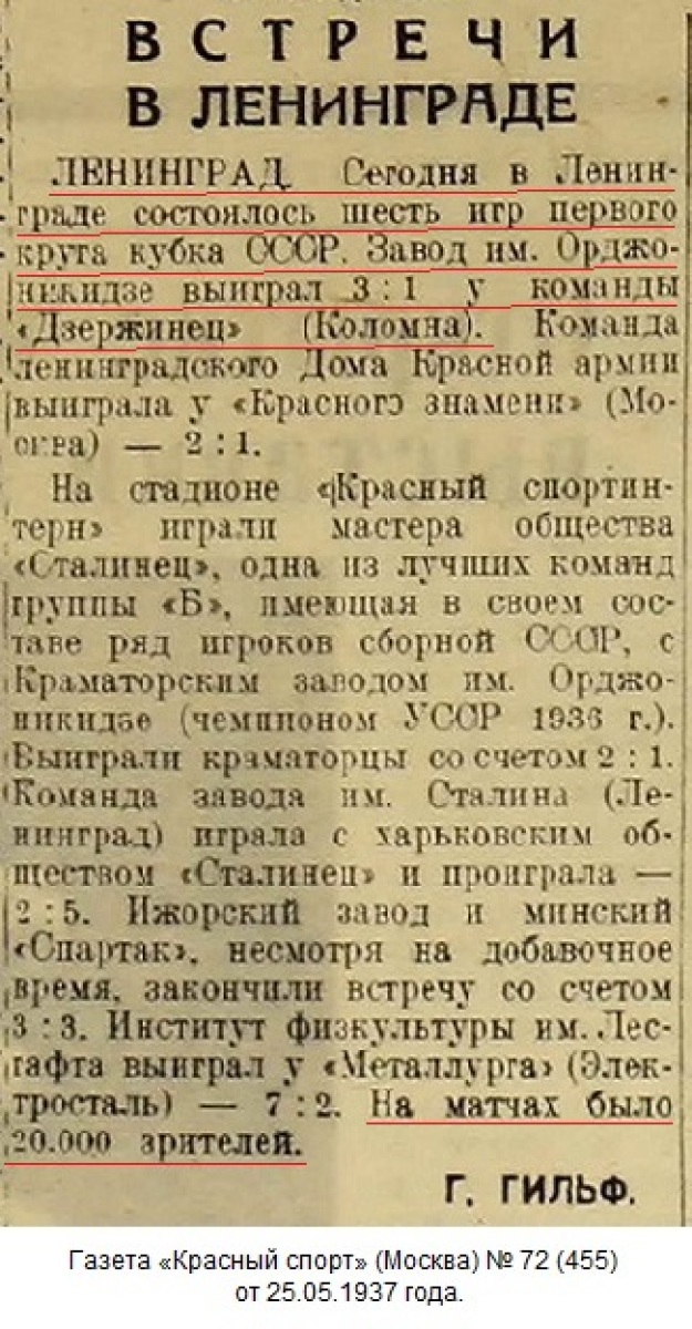 Комментарий. Накануне матча в Ленинградский областной комитет по делам физкультуры и спорта поступило письмо (исх. № 506 от 21 мая 1937 г.) за подписью Председателя Комитета по делам физкультуры и спорта Коломенского района т. Б.Гасилина следующего содержания: