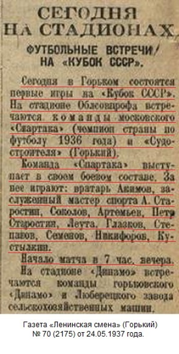 Матч на кубок СССР «Спартак» Москва – «Судостроитель» Сормово.
