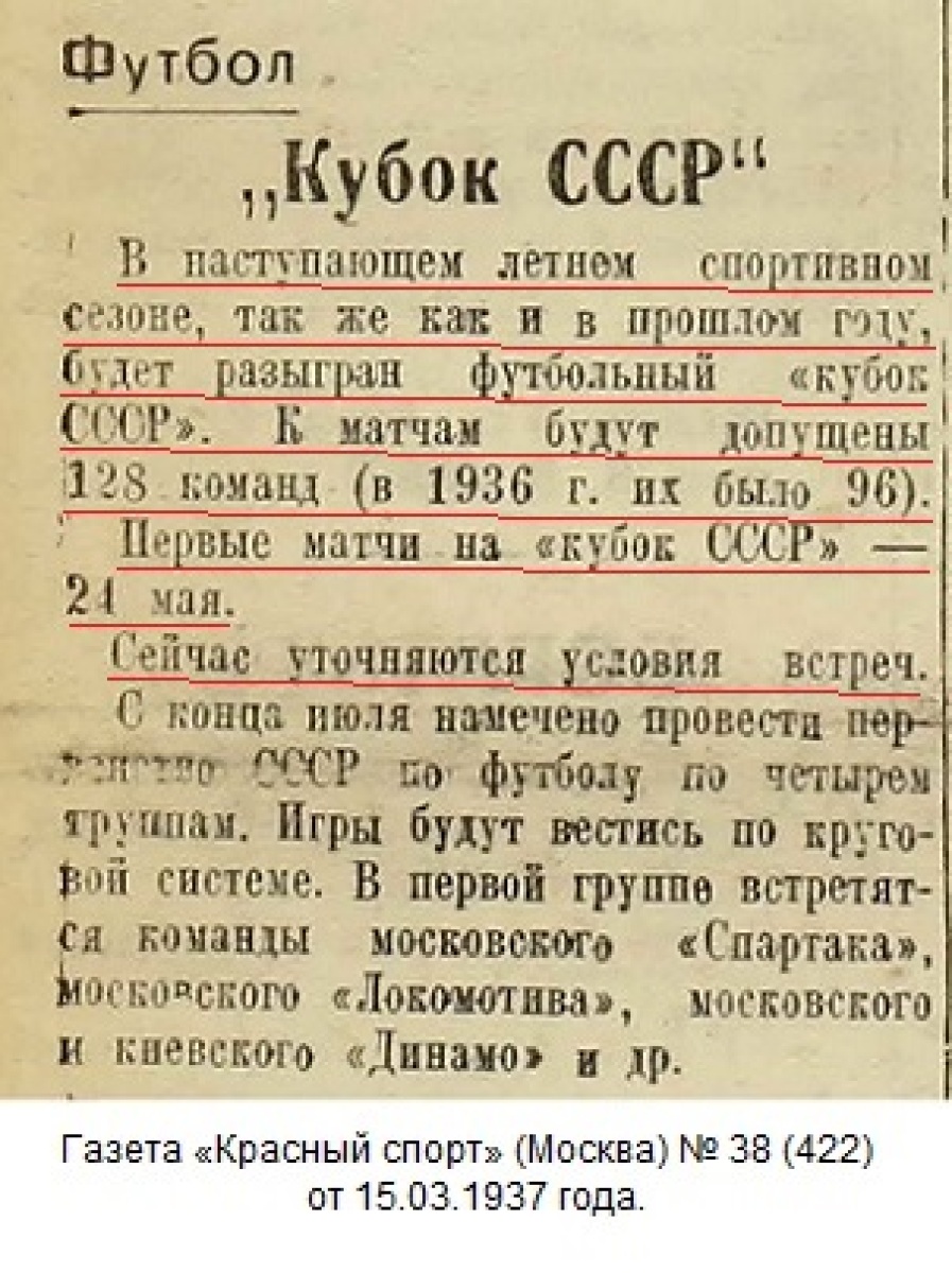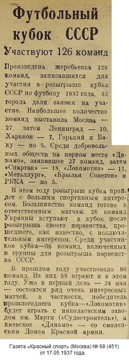 МОСКВА (Телеграфом от наш. кор.). 24 мая 124 футбольные команды Союза ССР в 51 городе выйдут соревноваться за футбольный «Кубок СССР».