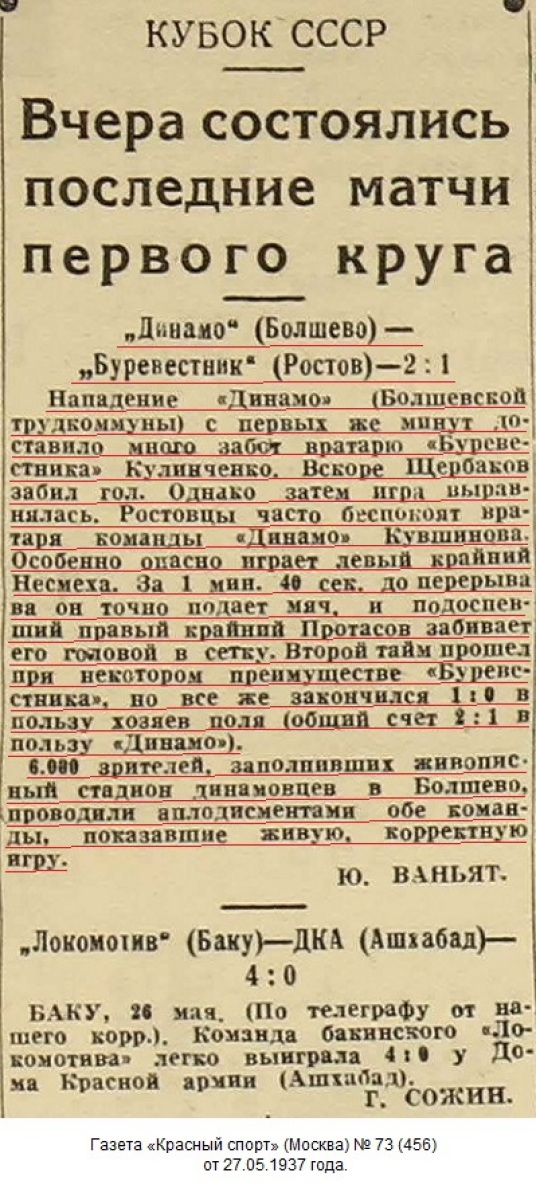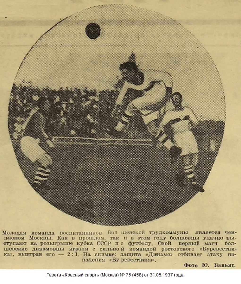 Первая встреча на кубок СССР между командами «Буревестник» Ростов-на-Дону и «Болшевской трудкоммуной» окончилась победой коммунаров со счетом 2:1.
