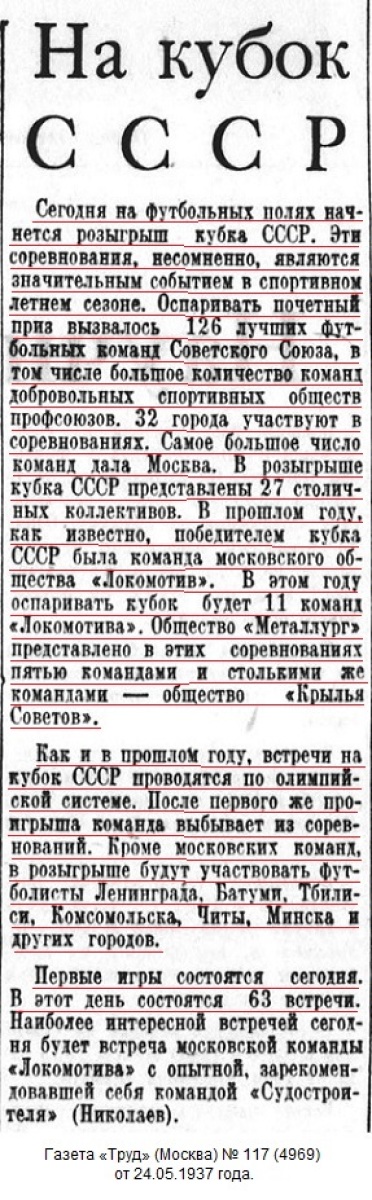 МОСКВА (Телеграфом от наш. кор.). 24 мая 124 футбольные команды Союза ССР в 51 городе выйдут соревноваться за футбольный «Кубок СССР».