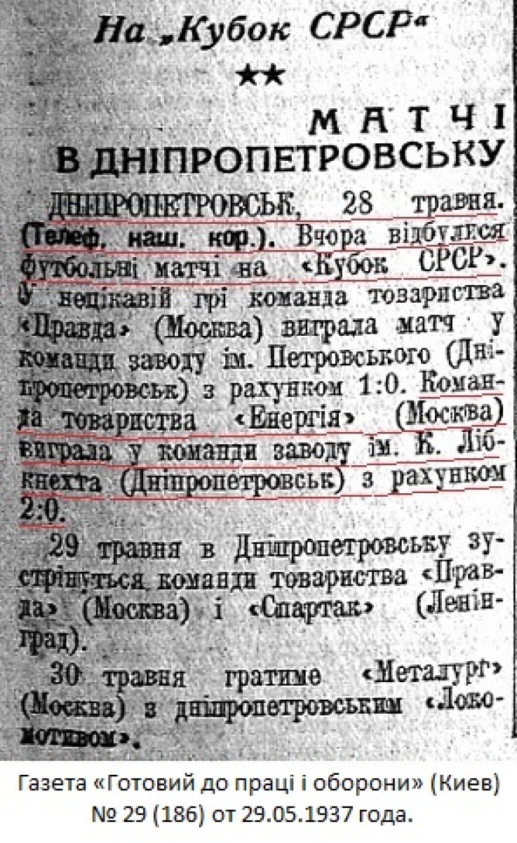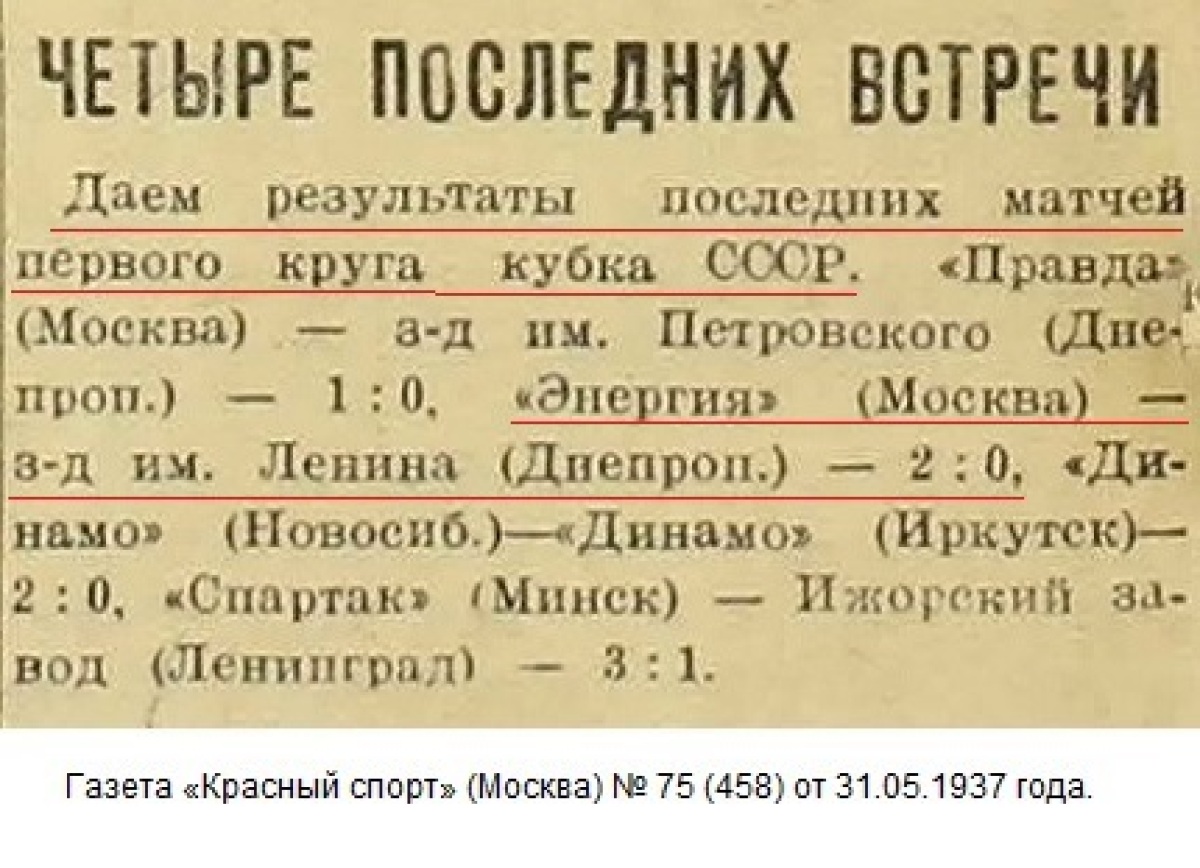 …Команда общества «Энергия» (Москва) выиграла у команды завода им. К.Либкнехта (Днепропетровск) со счетом 2:0…