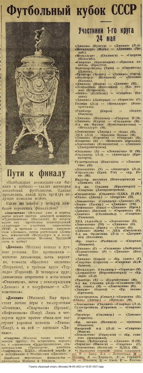 МОСКВА (Телеграфом от наш. кор.). 24 мая 124 футбольные команды Союза ССР в 51 городе выйдут соревноваться за футбольный «Кубок СССР».