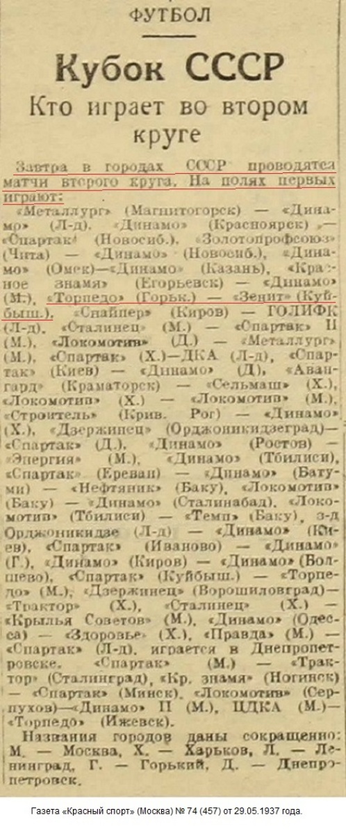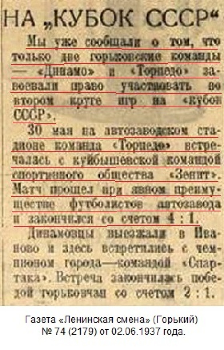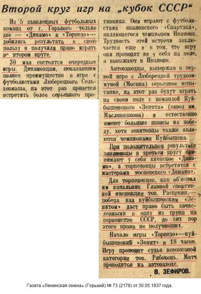 Во втором туре розыгрыша первенства на кубок СССР футбольная команда «Торпедо» встретилась с командой куйбышевского спортивного общества «Зенит». Матч состоялся 30-го мая на стадионе автозавода.