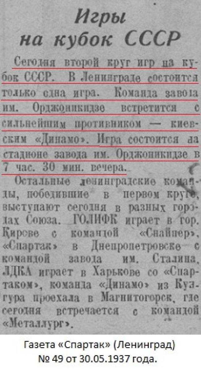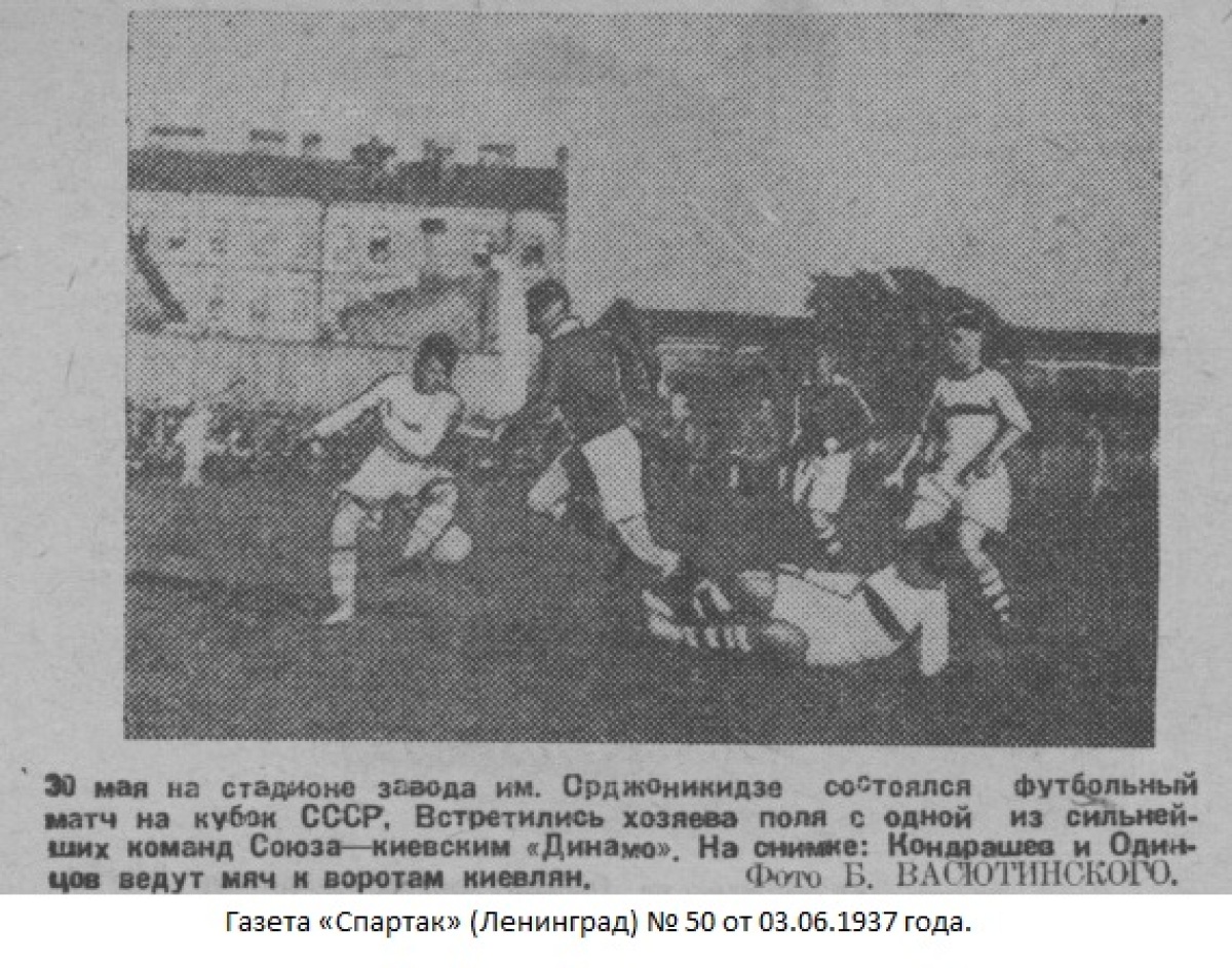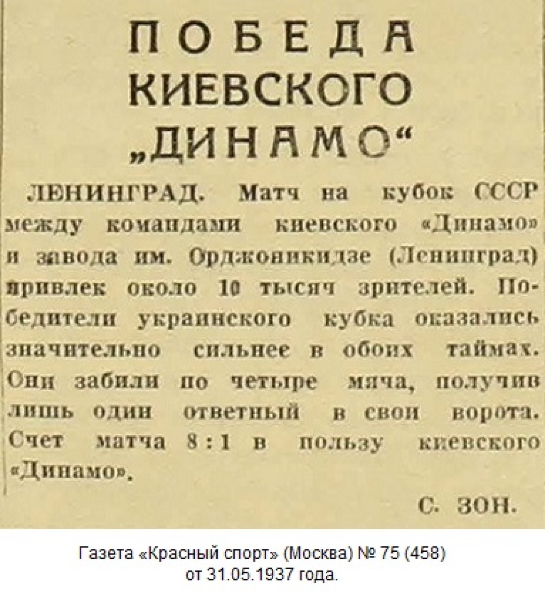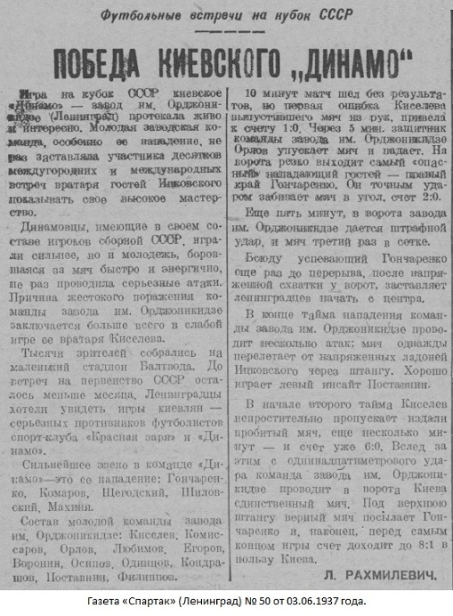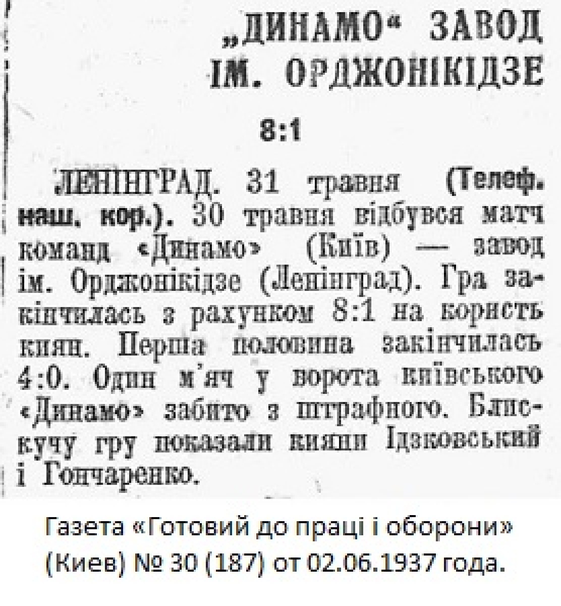 ЛЕНИНГРАД. 31 мая. (Телеф. наш кор.). 30 мая состоялся матч команд «Динамо» (Киев) – завод им. Орджоникидзе (Ленинград). Игра закончилась со счетом 8:1 в пользу киевлян. Первая половина закончилась 4:0. Один мяч в ворота киевского «Динамо» забит со штрафного. Блестящую игру показали киевляне Идзковский и Гончаренко.