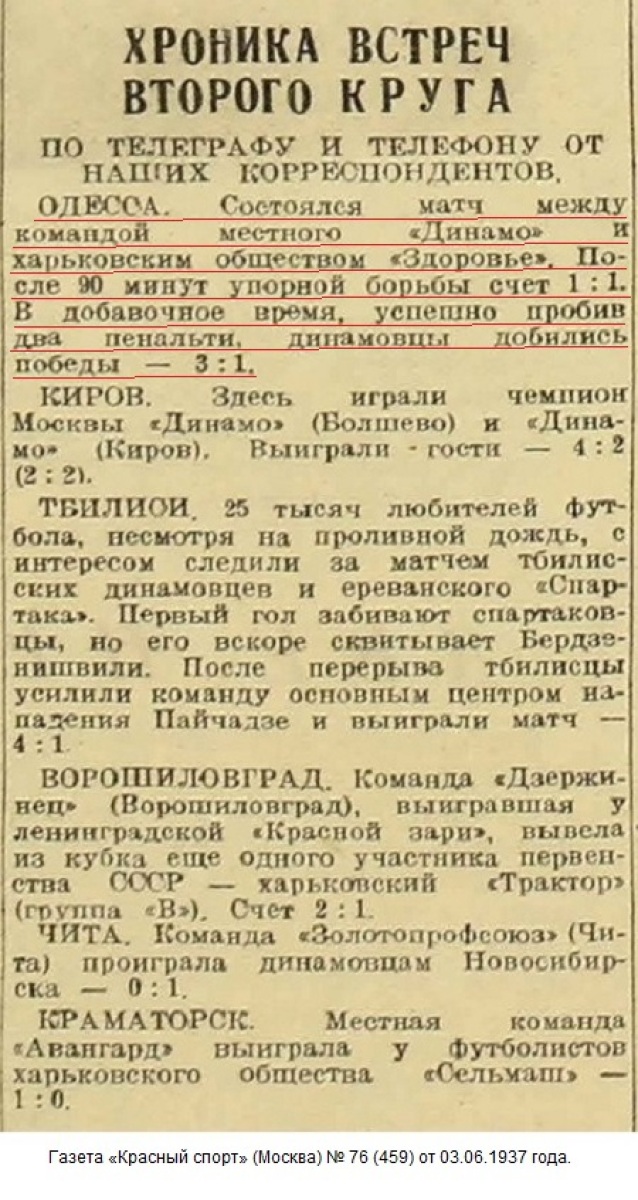 В дополнительной 30-минутке при счете 1:1 судья из Москвы П.Рывкин назначил в ворота «Здоровья» на 100-й и 110-й минутах сомнительные пенальти, которые одессит Л.Орехов успешно реализовал. Также во время игры был удален с поля Н.Капустин. Все это повлияло на характер игры харьковчан. Одесситы воспользовались растерянностью футболистов «Здоровья» и таким образом довели матч до победы со счетом 3:1.