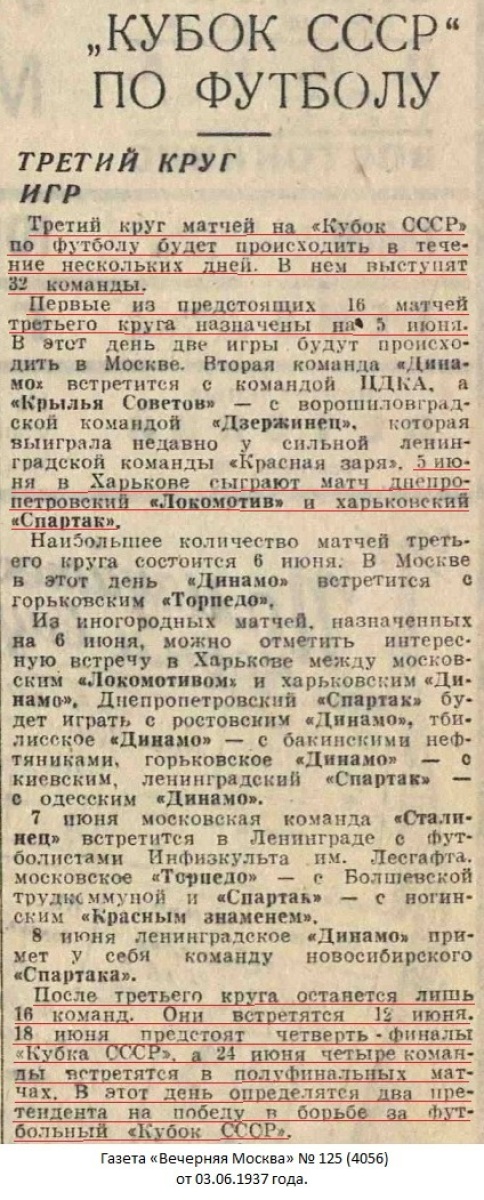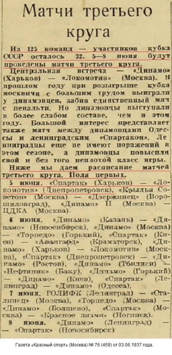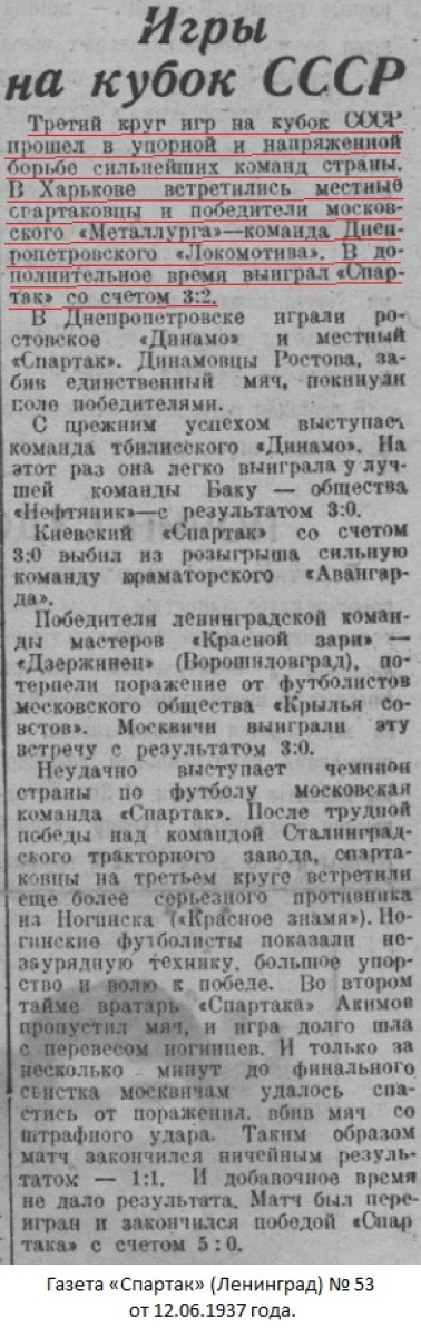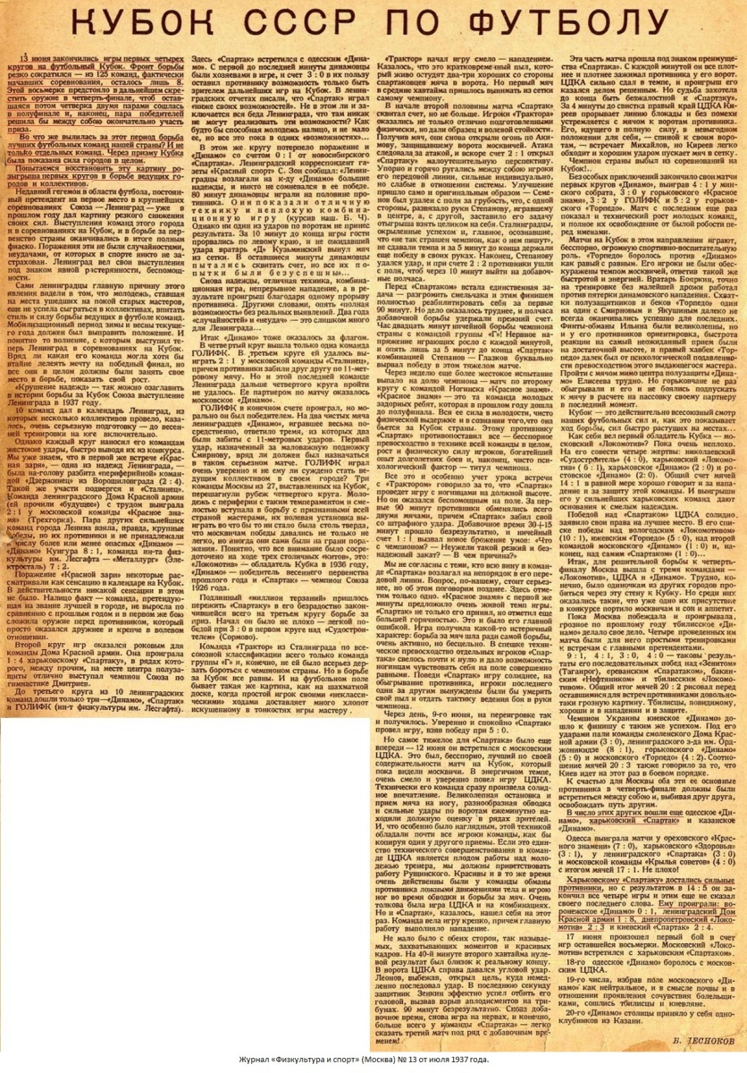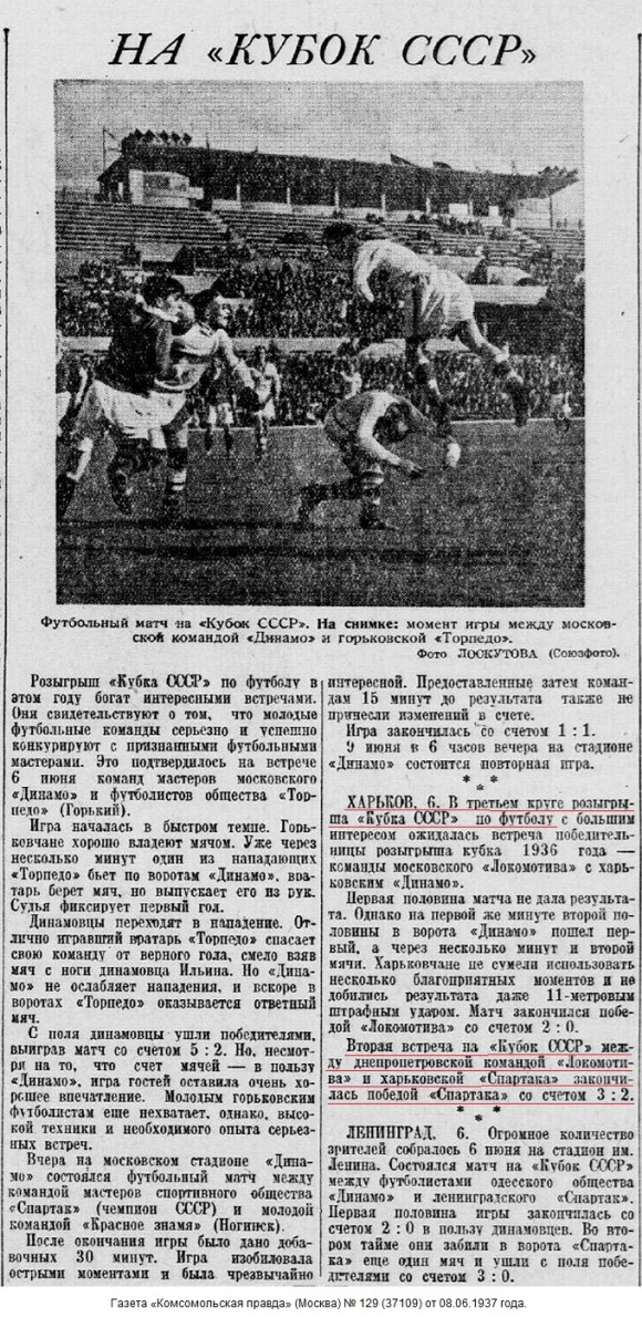 г.Харьков, Июня 5 дня. Мы, нижеподписавшиеся, Представитель футбольной команды Днепропетровского Совета Спортивного О-ва «Локомотив» тов. Рахлин, Представитель Харьковского Обл. Совета Ф.К. О-ва «Спартак» тов. Тышковец Л.В. и судья тов. Сельцов составили настоящий акт в том, что на основании положения Всесоюзного Комитета по Делам Ф.К. И СПОРТА при СНК СССР, сего числа проверено количество проданных билетов на футбольный матч на КУБОК СССР, состоявшийся 5-го июня 1937 г. между командами: Днепропетровск (Локомотив) – Харьков (Спартак), при чем оказалось проданных билетов:
