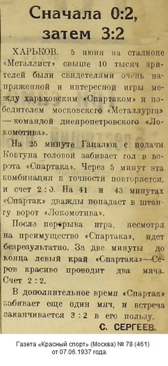 ХАРЬКОВ. 7 июня. (Наш кор.). С большой заинтересованностью харьковчане наблюдали за матчем недавнего победителя над московской командой «Металлург» – днепропетровского «Локомотива» с харьковским «Спартаком».
