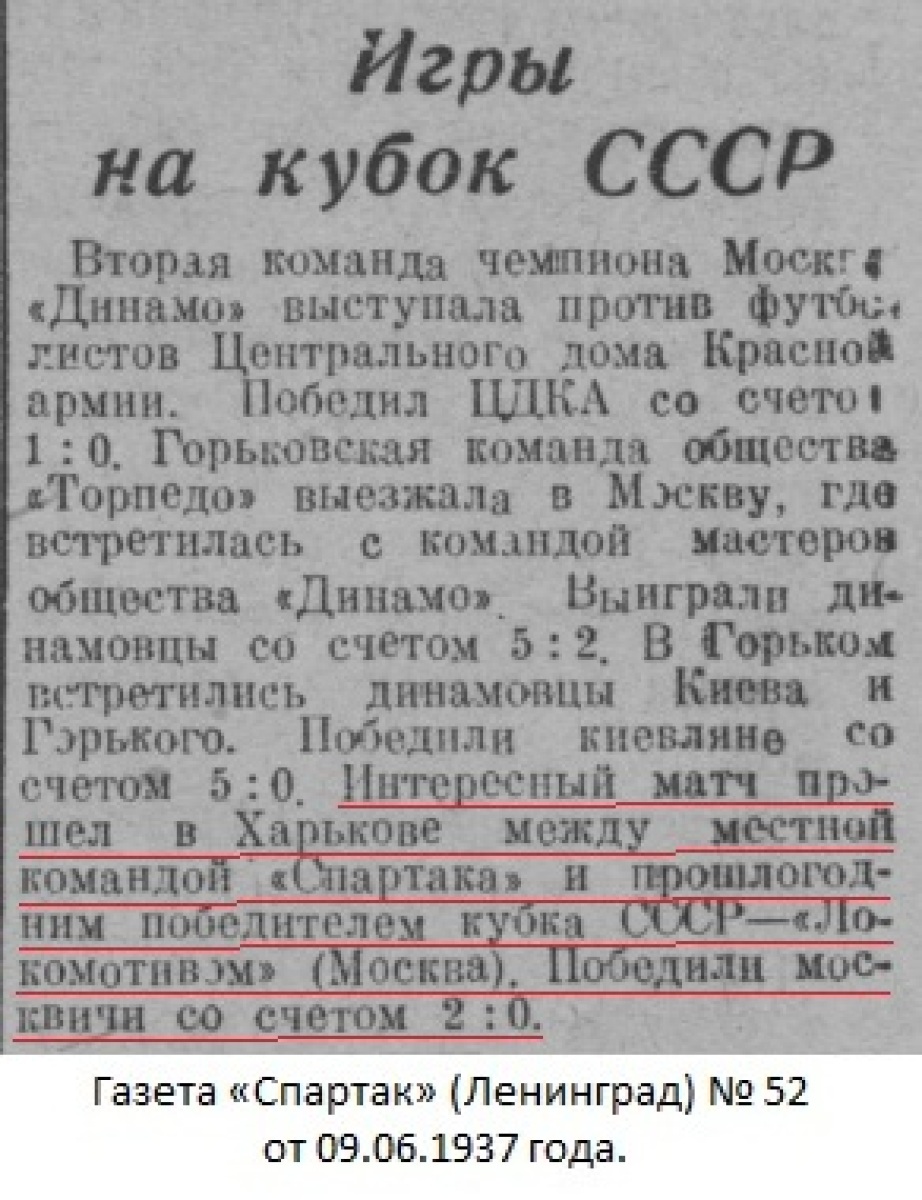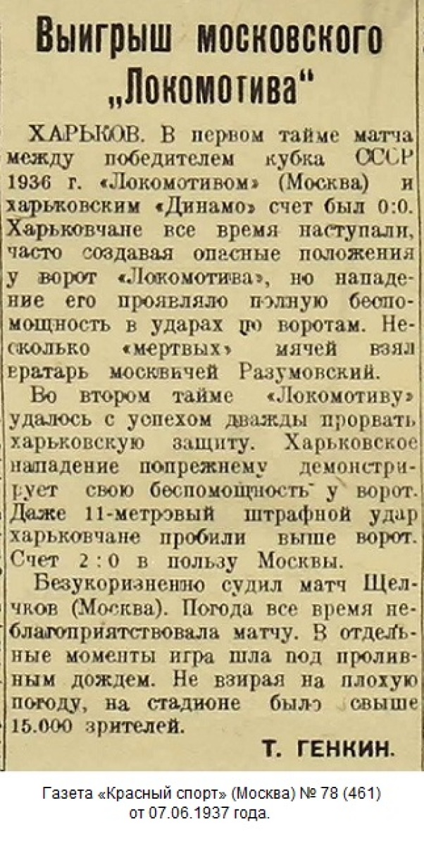 ХАРЬКОВ. 7 июня. (Наш. кор.). Встреча между победителем «Кубка СССР» в прошлом году – московским «Локомотивом» и харьковским «Динамо» собрала, несмотря на плохую погоду, большое количество зрителей. Первый тайм – 0:0. Во втором тайме «Локомотив» проводит два мяча и уходит с поля победителем. У харьковчан чувствуется отсутствие сыгранности.