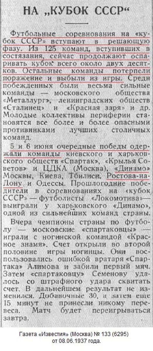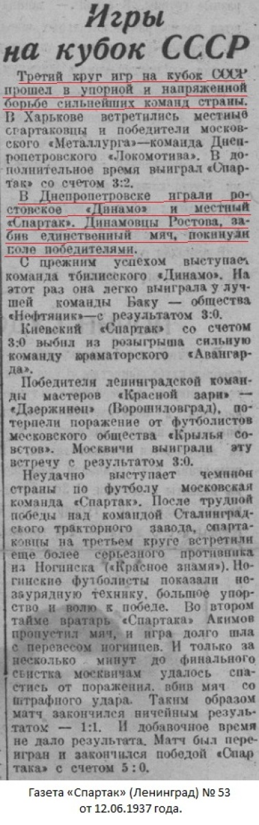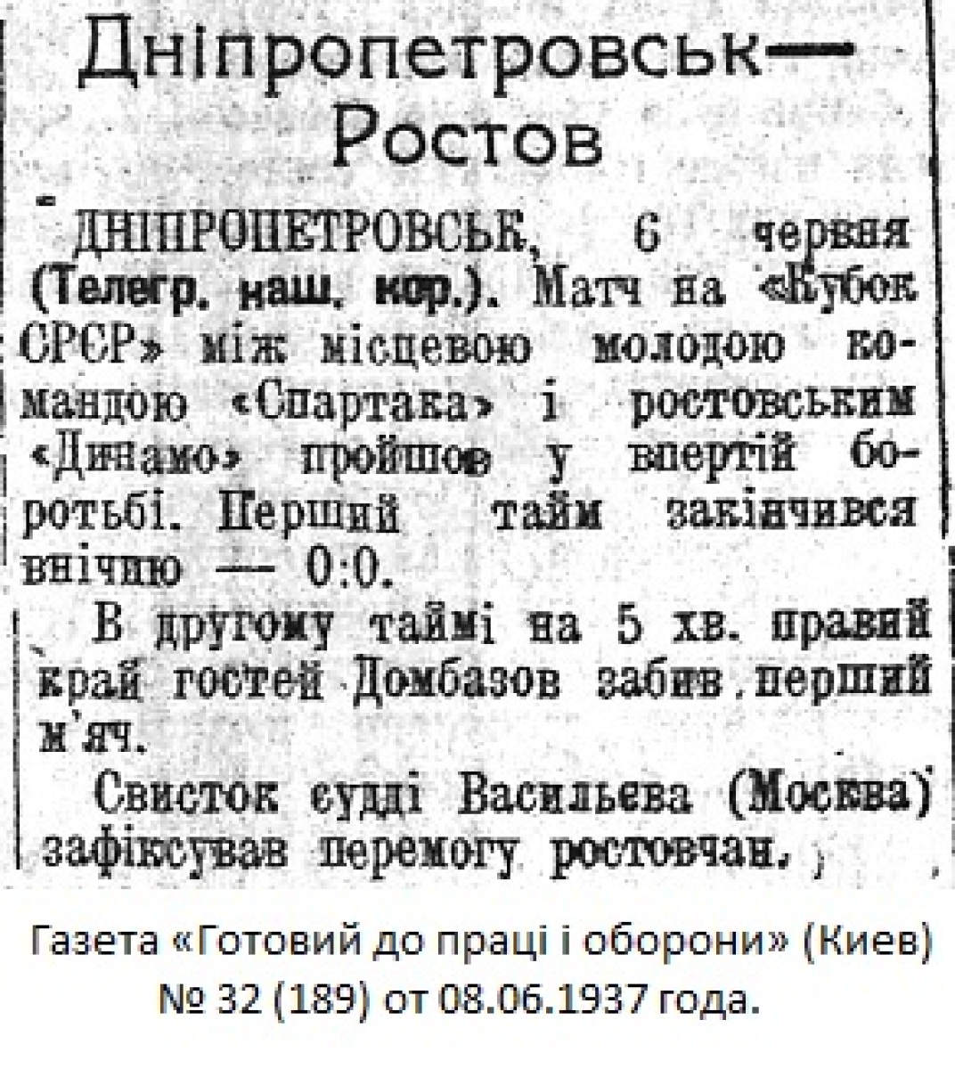 ДНЕПРОПЕТРОВСК. 6 июня. (Телегр. наш. кор.). Матч на «Кубок СССР» между местной молодой командой «Спартака» и ростовским «Динамо» прошел в упрямой борьбе. Первый тайм закончился вничью – 0:0.