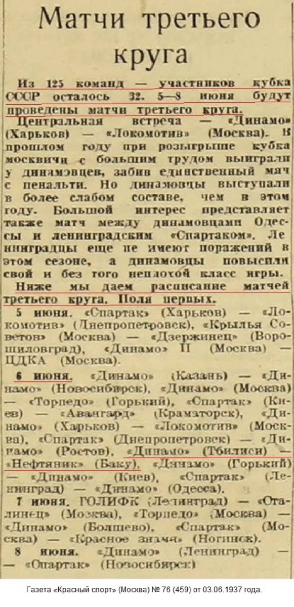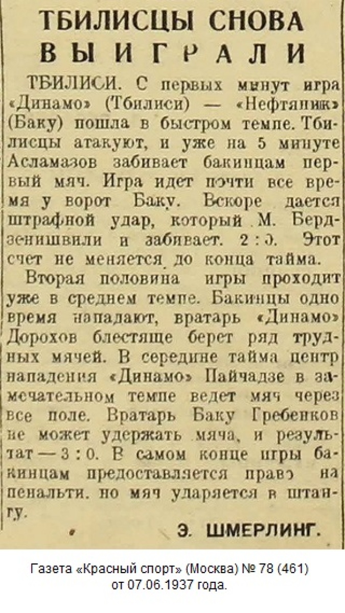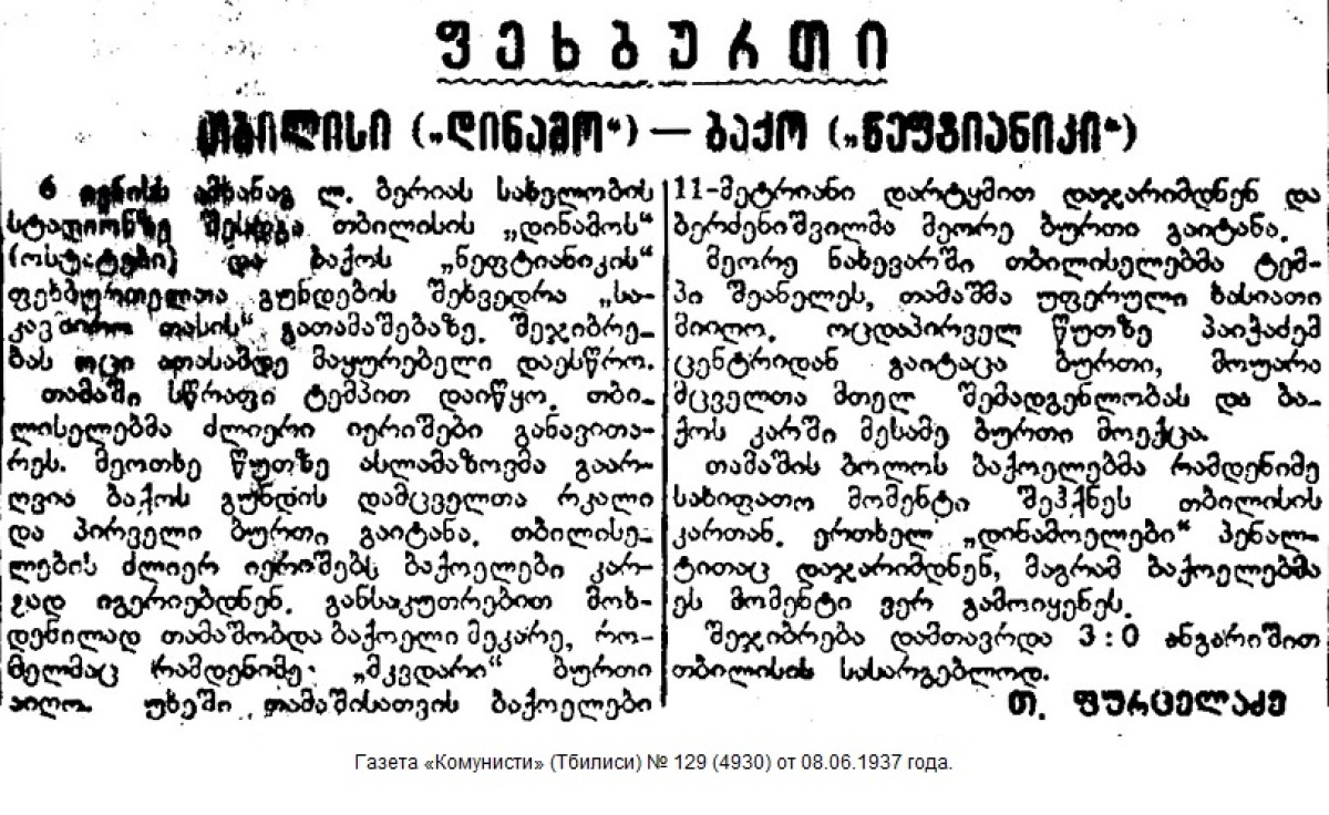 Очередной футбольный матч на «Кубок СССР» команд «Динамо» (Тбилиси) и «Нефтяник» (Баку), состоявшийся 6 июня, привлек на стадион им. Берия тысячи зрителей.