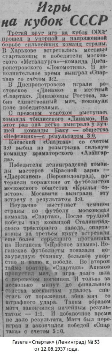 6 июня на стадионе «Динамо» им. Л.Берия состоялся матч на «кубок СССР» между тбилисской командой мастеров «Динамо» и бакинской командой спортивного общества «Нефтяник».