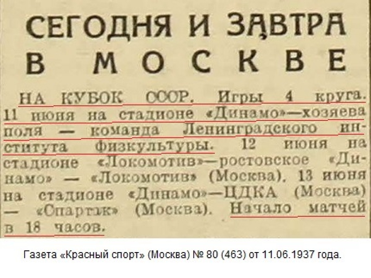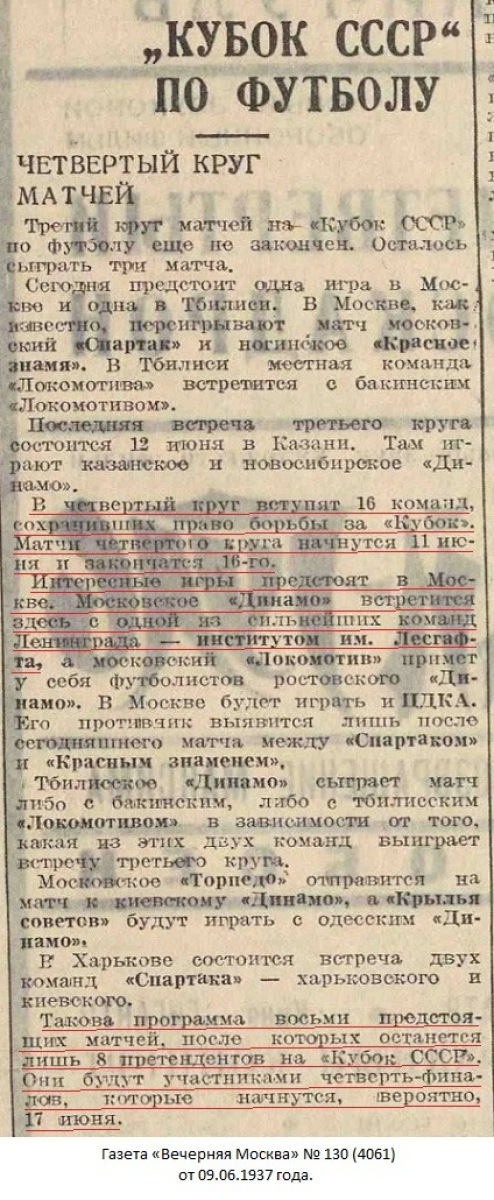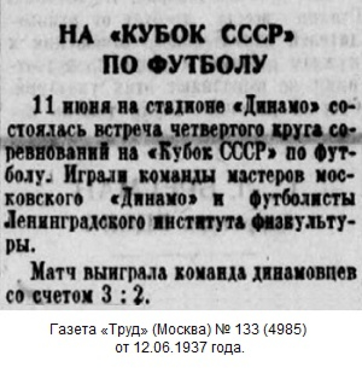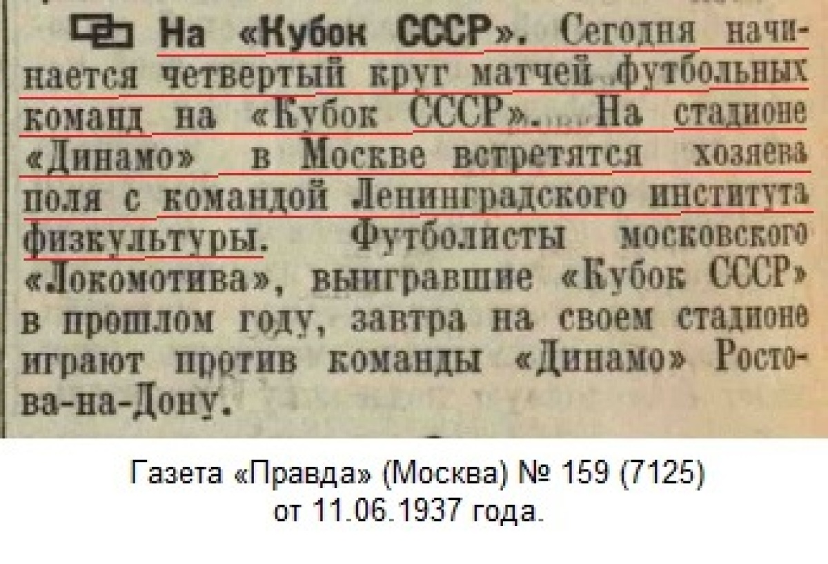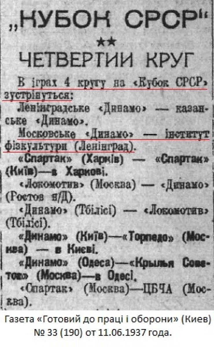 «КУБОК СССР».ЧЕТВЕРТЫЙ КРУГ.В играх 4 круга на «Кубок СССР» встретятся:...Московское «Динамо» – институт физкультуры (Ленинград)...Газета «Готовий до праці і оборони» (Киев) № 33 (190) от 11.06.1937 года (перевод).