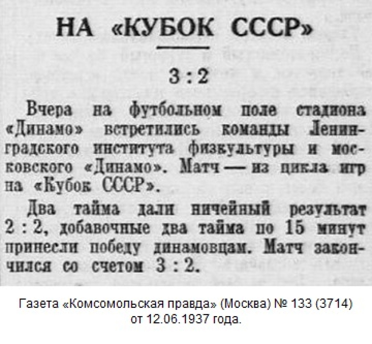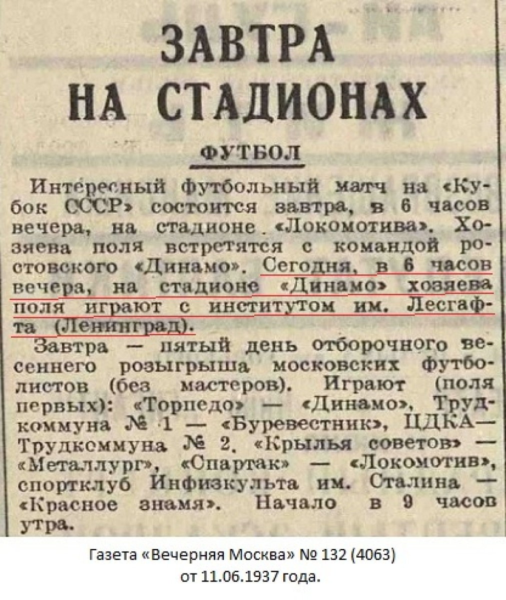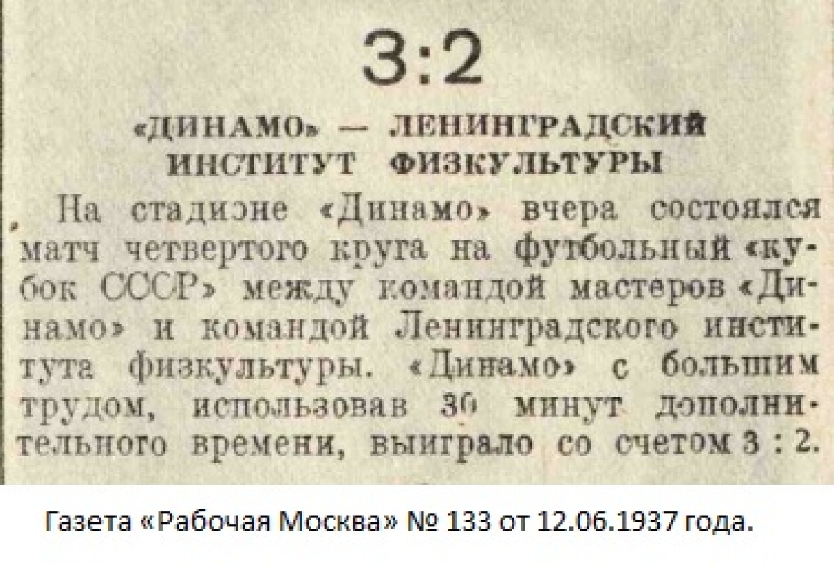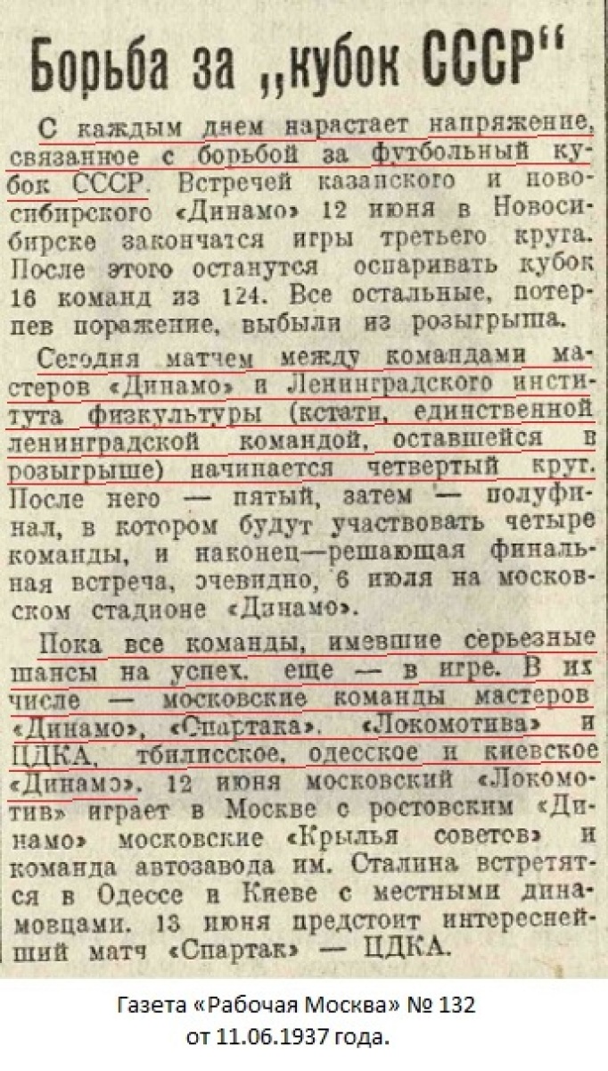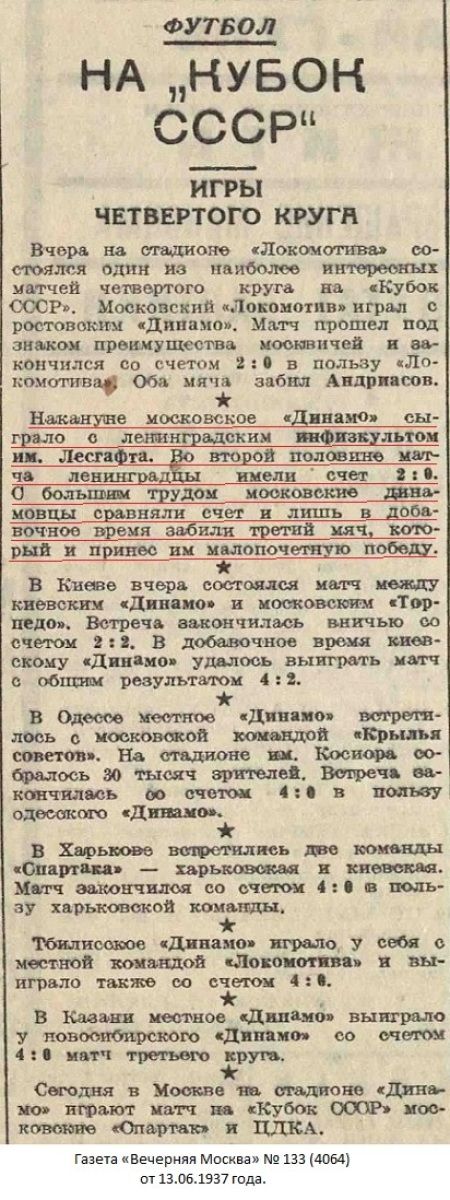 «КУБОК СССР».ЧЕТВЕРТЫЙ КРУГ.В играх 4 круга на «Кубок СССР» встретятся:...Московское «Динамо» – институт физкультуры (Ленинград)...Газета «Готовий до праці і оборони» (Киев) № 33 (190) от 11.06.1937 года (перевод).