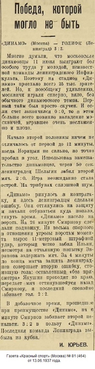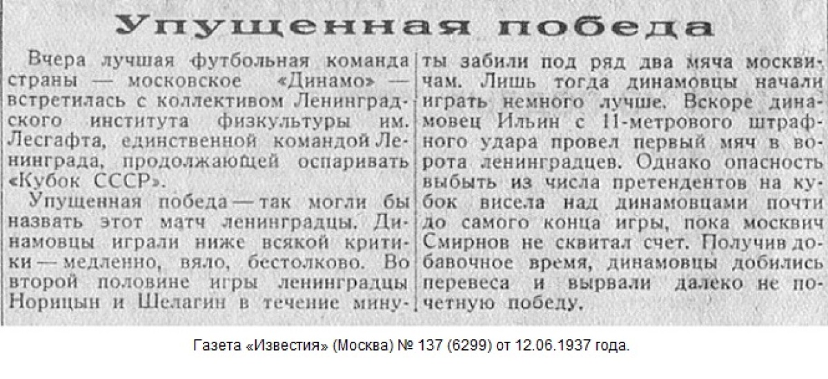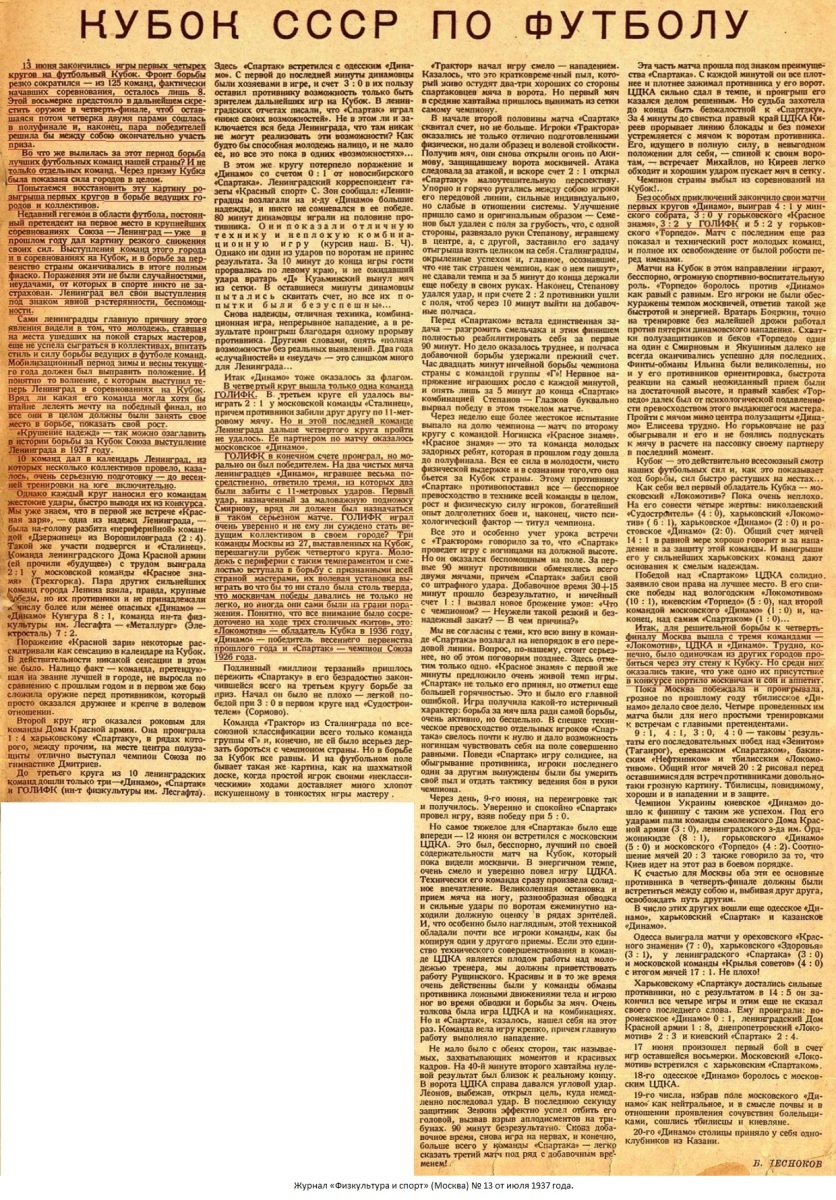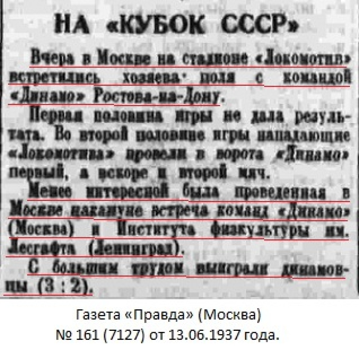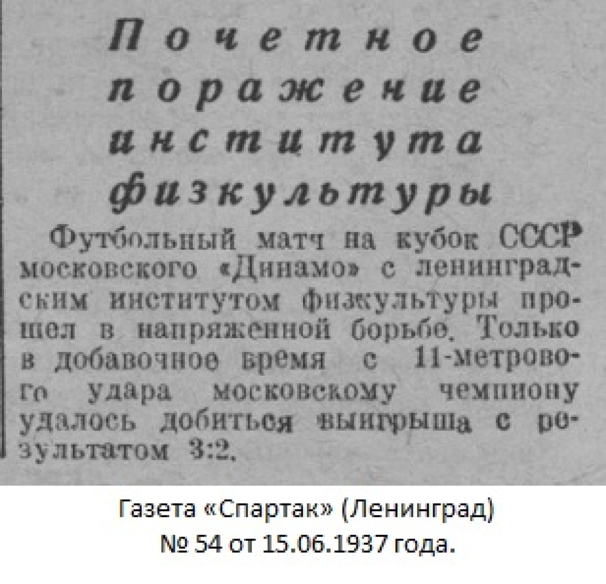 «КУБОК СССР».ЧЕТВЕРТЫЙ КРУГ.В играх 4 круга на «Кубок СССР» встретятся:...Московское «Динамо» – институт физкультуры (Ленинград)...Газета «Готовий до праці і оборони» (Киев) № 33 (190) от 11.06.1937 года (перевод).