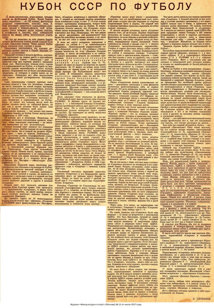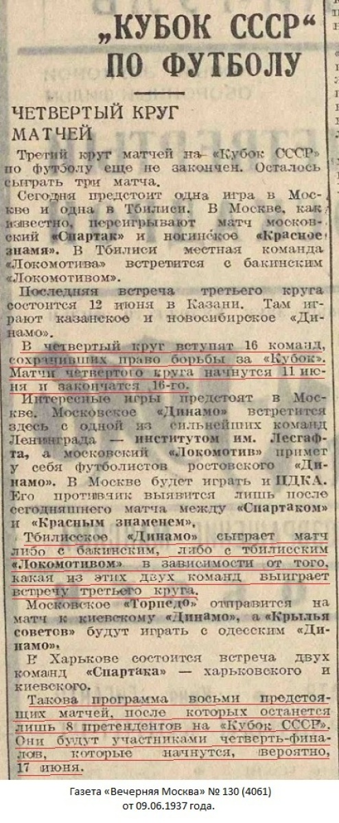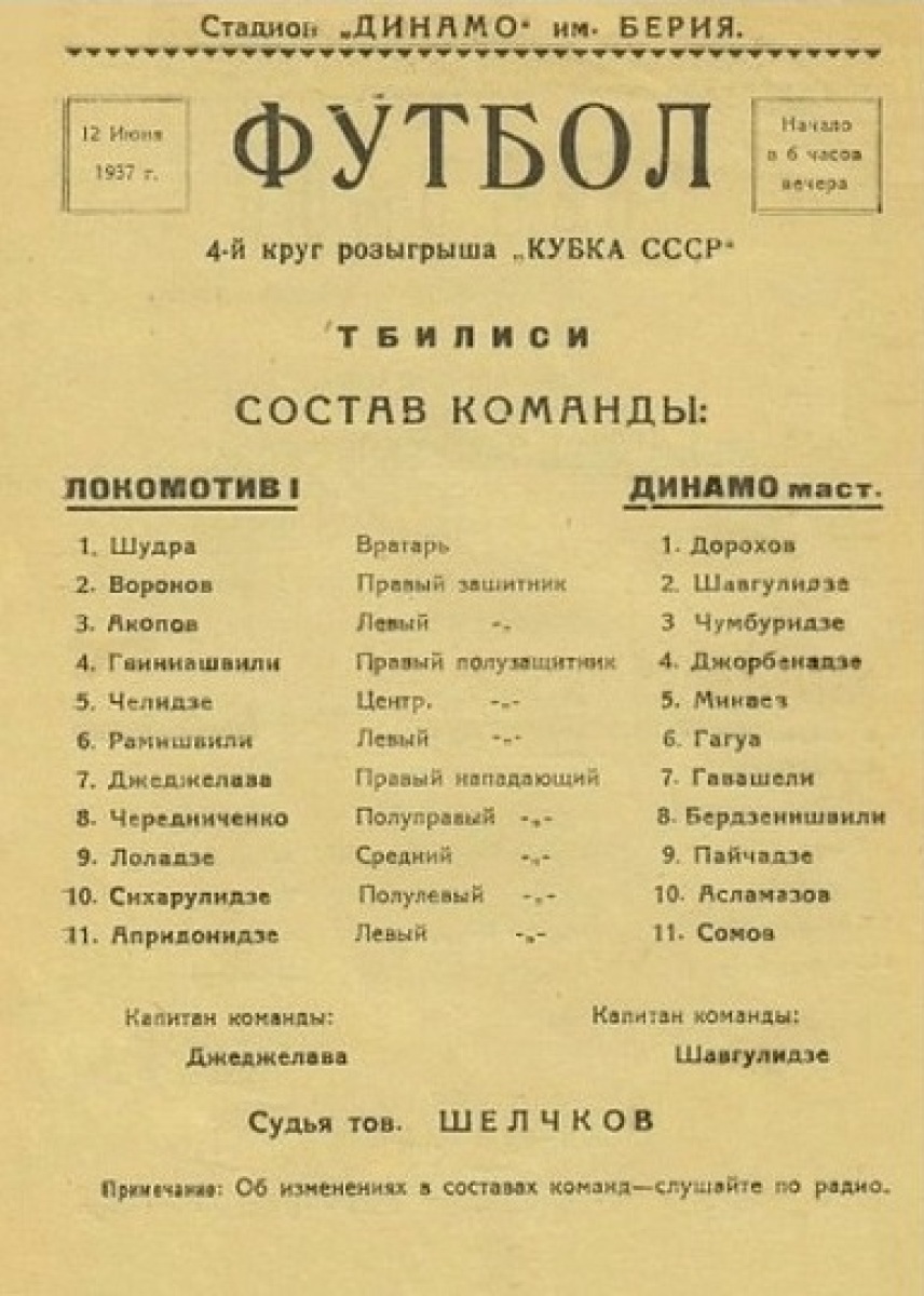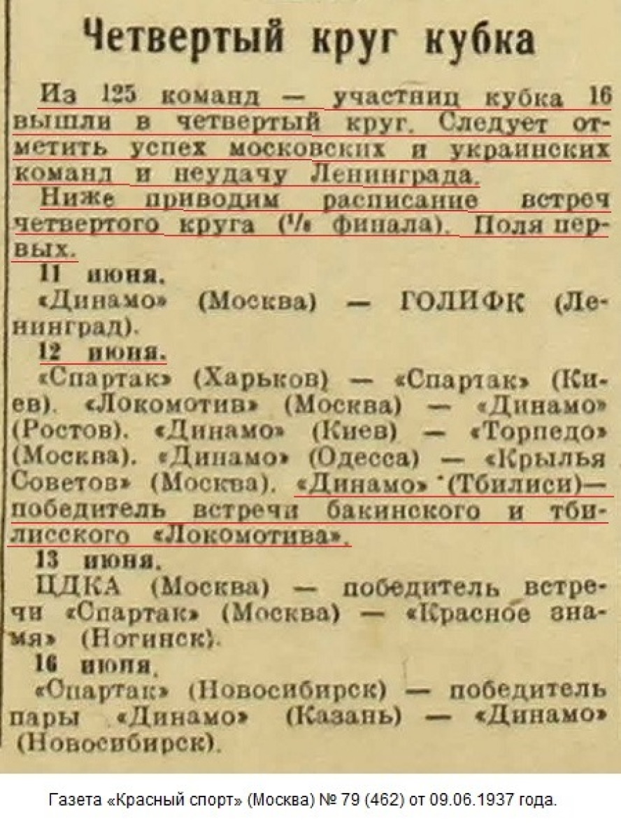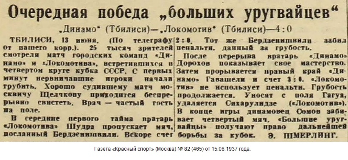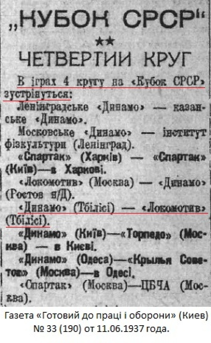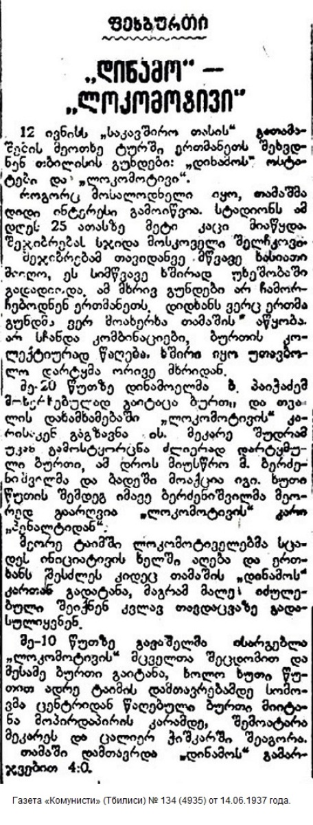 Обе тбилисские команды, игравшие 12 июня, – мастера «Динамо» и «Локомотив» зарекомендовали себя во встречах на «кубок СССР» с наилучшей стороны. Динамовцы, играя с таганрогской командой «Зенит», выиграли со счетом 9:1, у ереванского «Спартака» – 4:1 и у бакинского «Нефтяника» – 3:0. «Локомотив» хорошо провел все игры с командами Баку, выиграв у «Темпа» со счетом 3:1 и у «Динамо» 4:1.