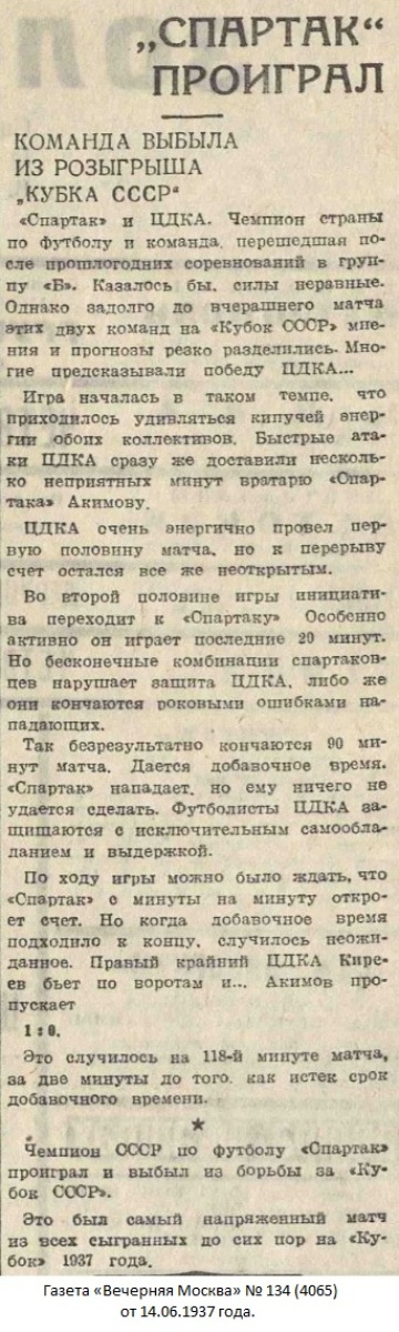 Добавочное время тоже проходило под знаком преимущества «Спартака». Леонов брал один мяч за другим, после смены ворот прекрасным броском снял мяч с головы Семенова. За четыре минуты до конца Киреев по правому краю прорвался сквозь ушедшую далеко вперед защиту, обошел Михайлова и отличным ударом забил мяч. 1:0. Счет до конца игры не изменился...